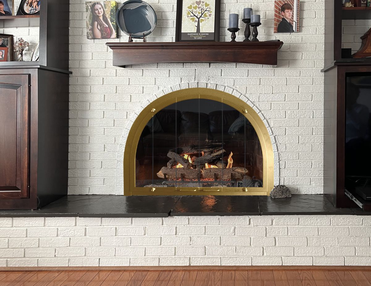 Option #3: Hearth Creations Steel Cabinet Full Arch Fireplace Door with Squared Sides in Black with Satin Brass Hinges and Handles, Clear Tempered Glass and Gate Mesh Backup Doors.