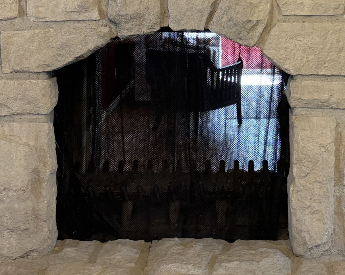 Option #6: Wrought Iron Detachable Frame Arched Fullview Bifold Fireplace Door in Black with Fullview Tempered or Fullview Ceramic Glass and Gate Mesh Backup Doors. This door features a frame that is pieced together behind the stone. The mesh curtains would need to be removed and replaced with gate mesh backup doors that are attached to door frame.