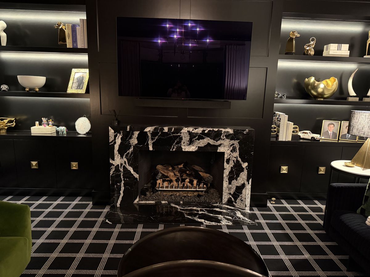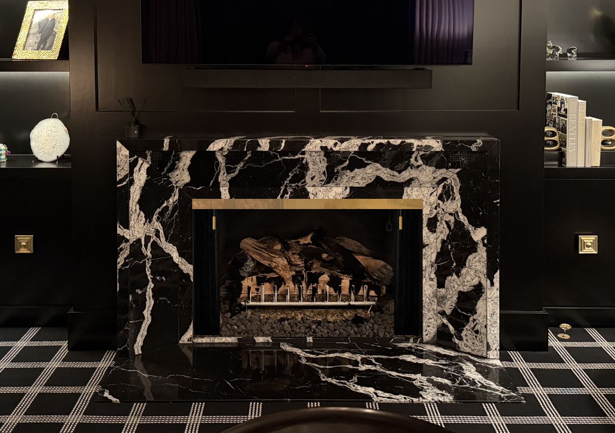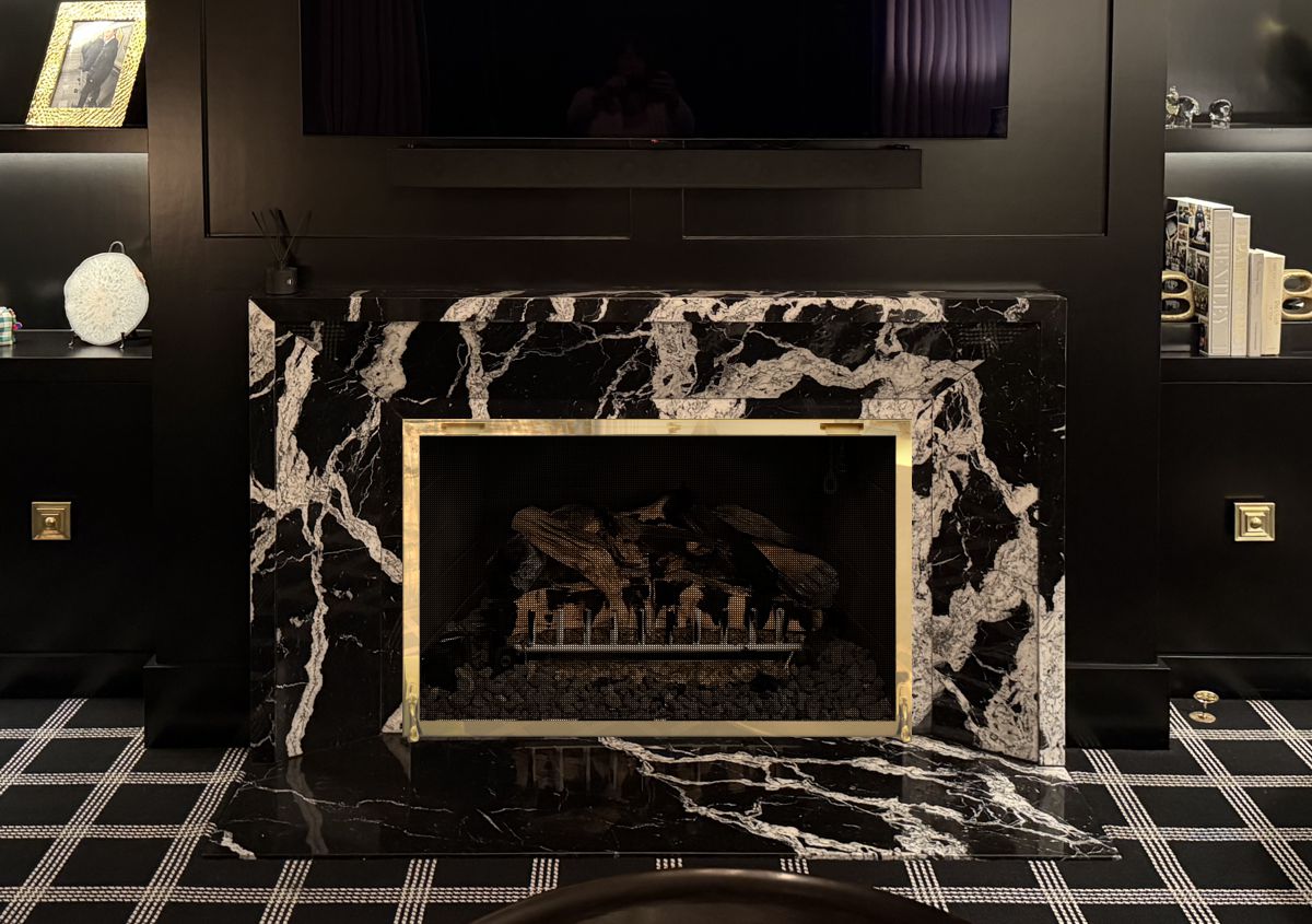 Our Comments: Looks like either polished brass or black with polished brass is in order for this modern room. Here are some different types of screens that can be made in those finishes to fit your fireplace.