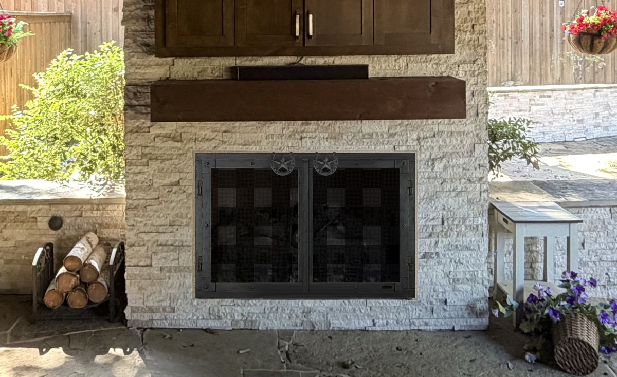 Option #2: Hand Crafted Zinc Coated Lone Star Wrought Iron Cabinet Outdoor Fireplace Mesh Door in Burnished Black.