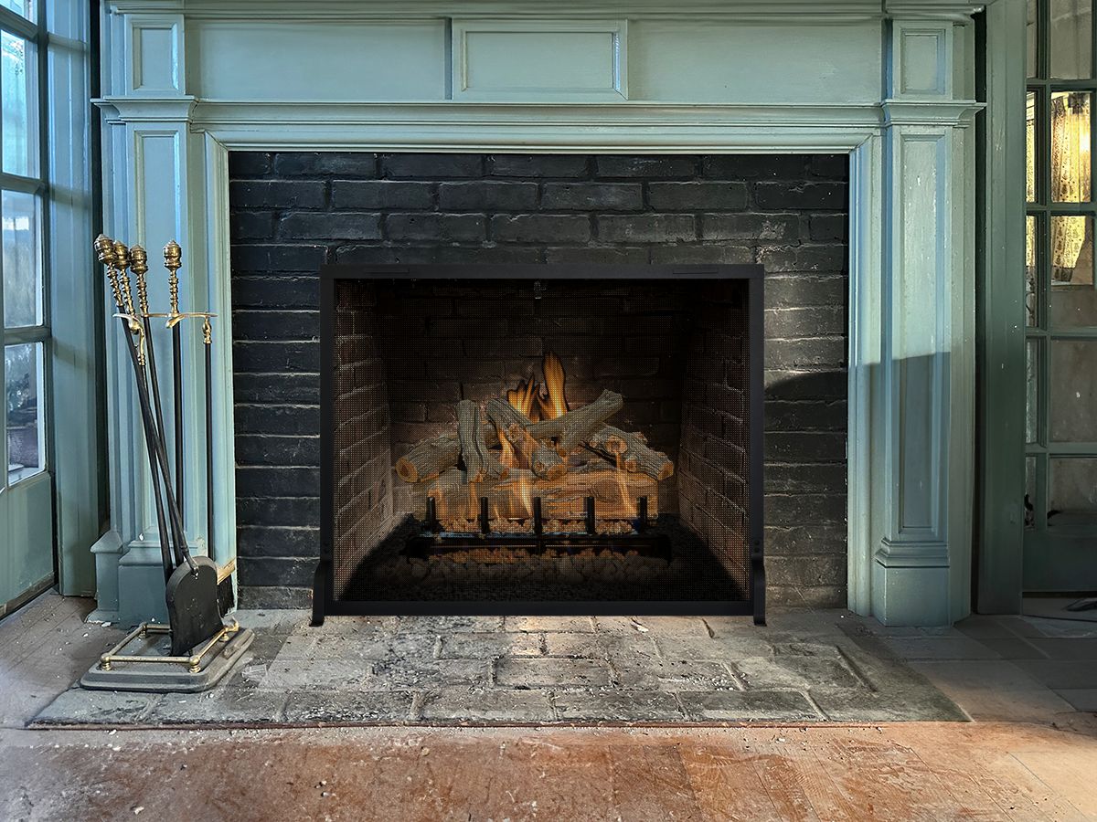 If you are planning on burning anything in your fireplace, you need to have mesh behind the glass so you can burn a fire with the doors open. You can chooe between gate mesh backup doors and sliding mesh curtains. Functionally, gate mesh performs the best as the wire has smaller holes that sparks cannot get through. Aesthetically, mesh curtains may be preferred because they do not have a vertical center frame that obstructs the view of the fire. When you are not using the fire or you want a complete unobstructed view, they do not stick out like gate mesh doors when they are opened.