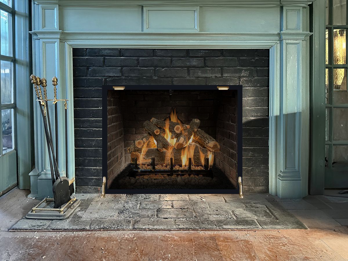 Option #5: Grand Canyon 24 Inch Quaking Aspen Gas Logs with 3-BURNER. Shown with Hearth Creations Modern-1 Fireplace Door with No Visible Handles in Black with Satin Brass Overlay Doors and Gas Log AirWash System for Buring Gas Fires with Doors Closed. Most other fireplace doors must be open when burning gas logs.