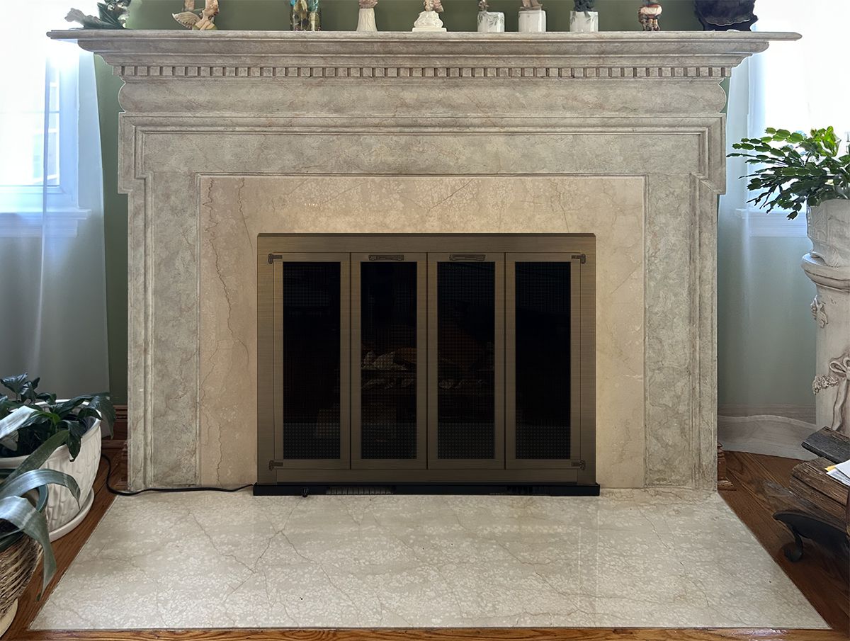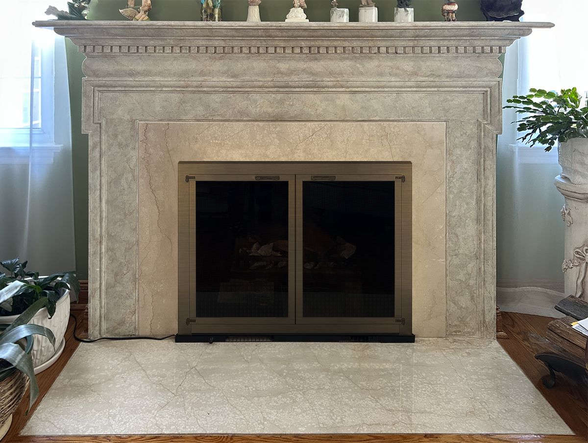 Customer Comments: We currently have glass doors without a screen on our wood burning fireplace. We also have an electric blower insert at the bottom of fireplace opening. We would like to have a screen included in our doors for safety purposes.