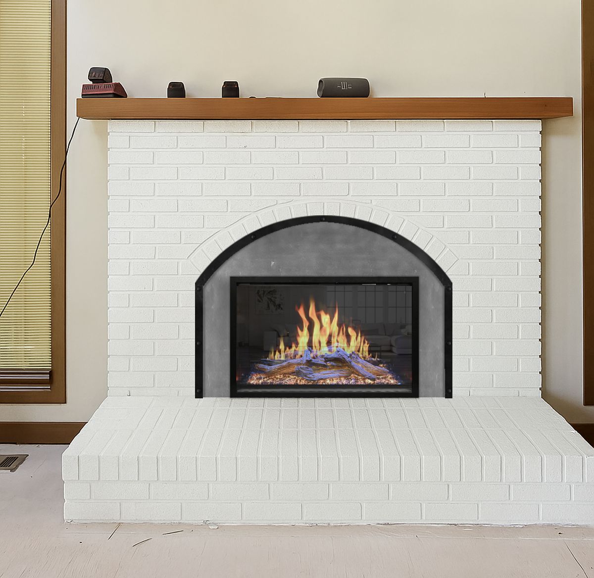 Option #: Modern Flames OR30-TRAD 30" Orion Electric Fireplace Insert with Custom Arch Surround in Buff Pewter with Riveted Black Trim.