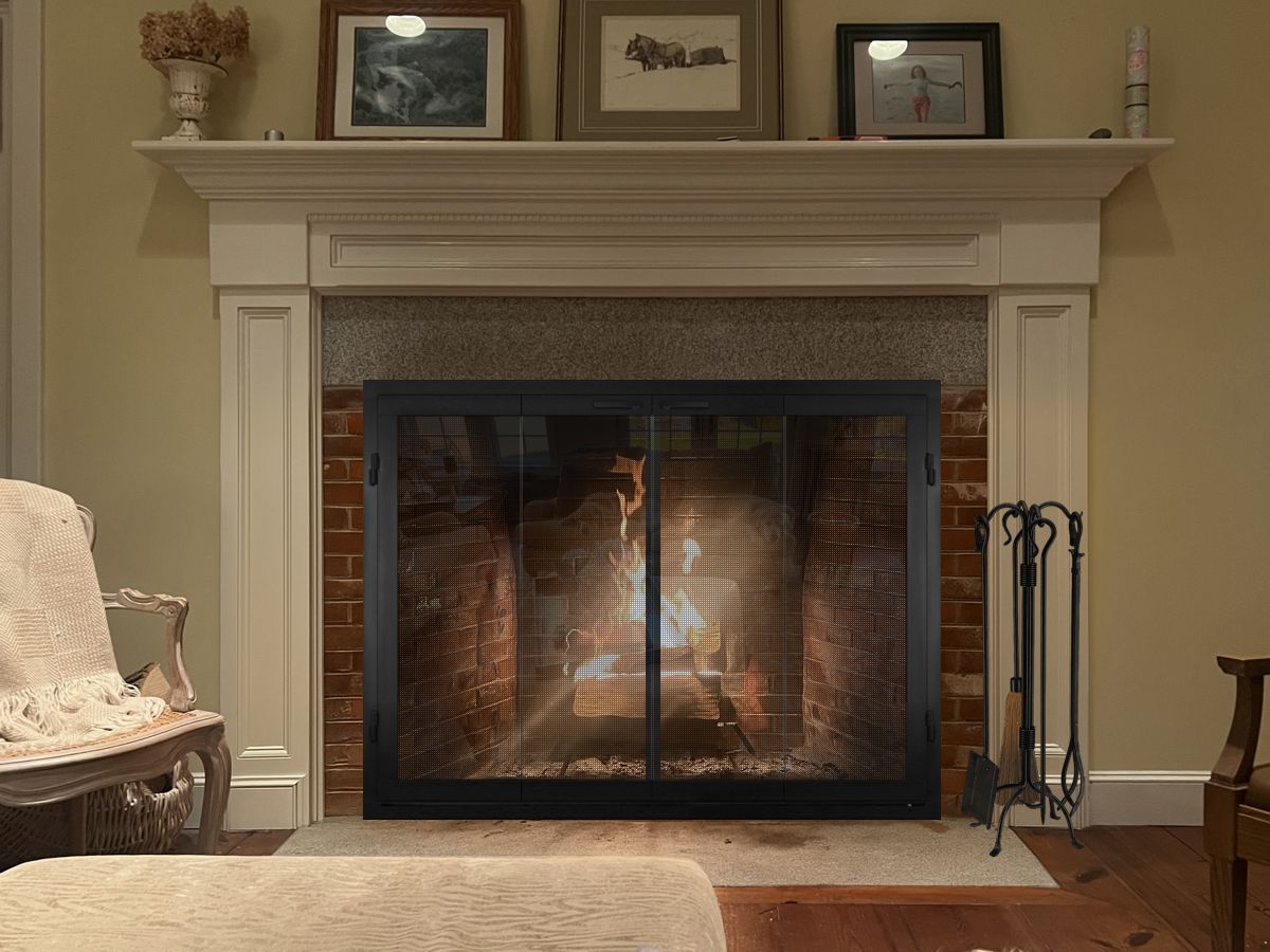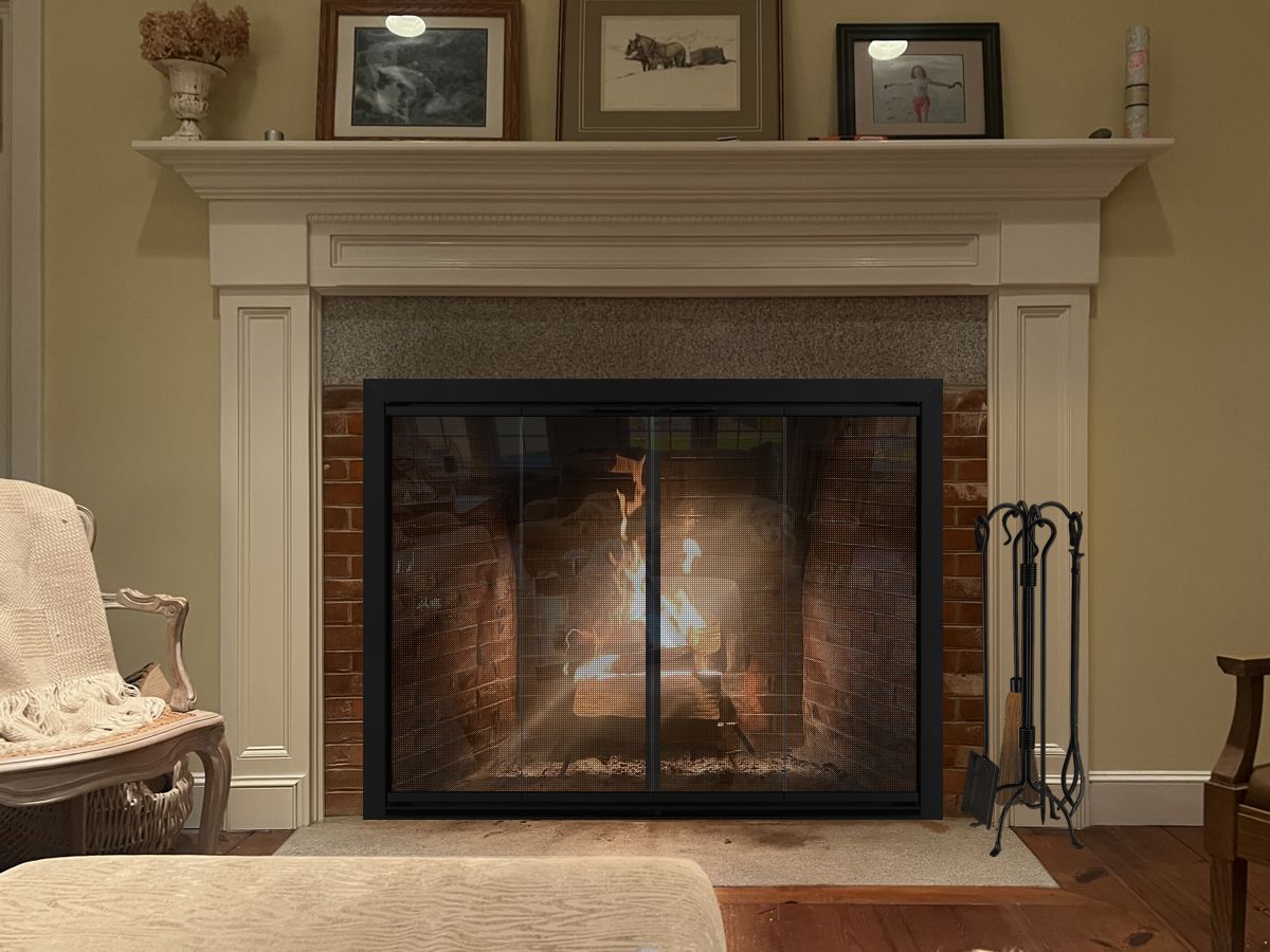 If you are planning on burning anything in your fireplace, you need to have mesh behind the glass so you can burn a fire with the doors open. You can chooe between gate mesh backup doors and sliding mesh curtains. Functionally, gate mesh performs the best as the wire has smaller holes that sparks cannot get through. Aesthetically, mesh curtains may be preferred because they do not have a vertical center frame that obstructs the view of the fire. When you are not using the fire or you want a complete unobstructed view, they do not stick out like gate mesh doors when they are opened.