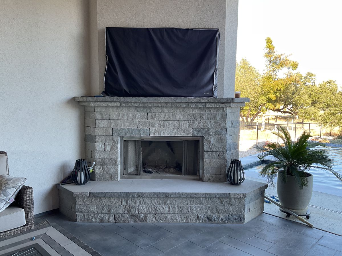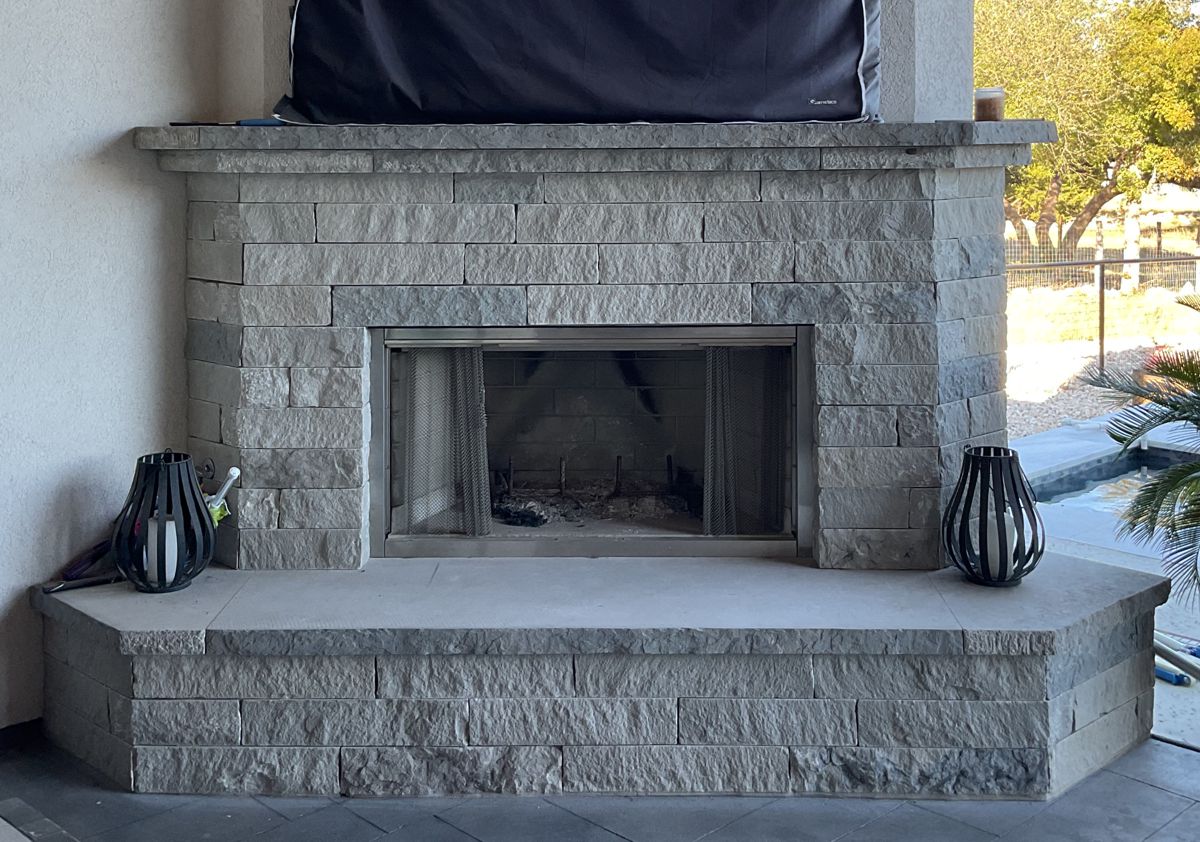 Option #2: Hearth Creations Profile-2 Aluminum Bifold Outdoor Fireplace Door in Black. Shown Overlapping the Stone. Attaches with pressure mount screws, no drilling required.