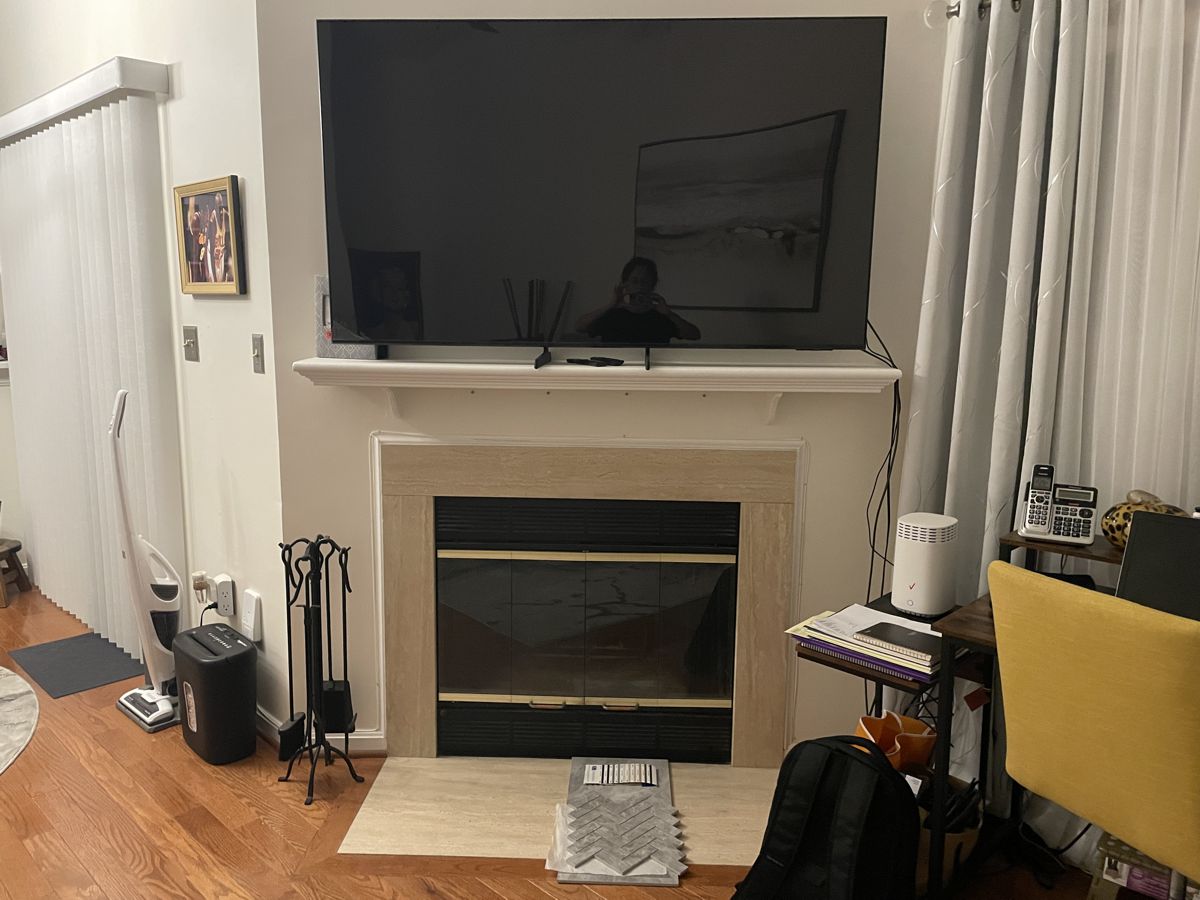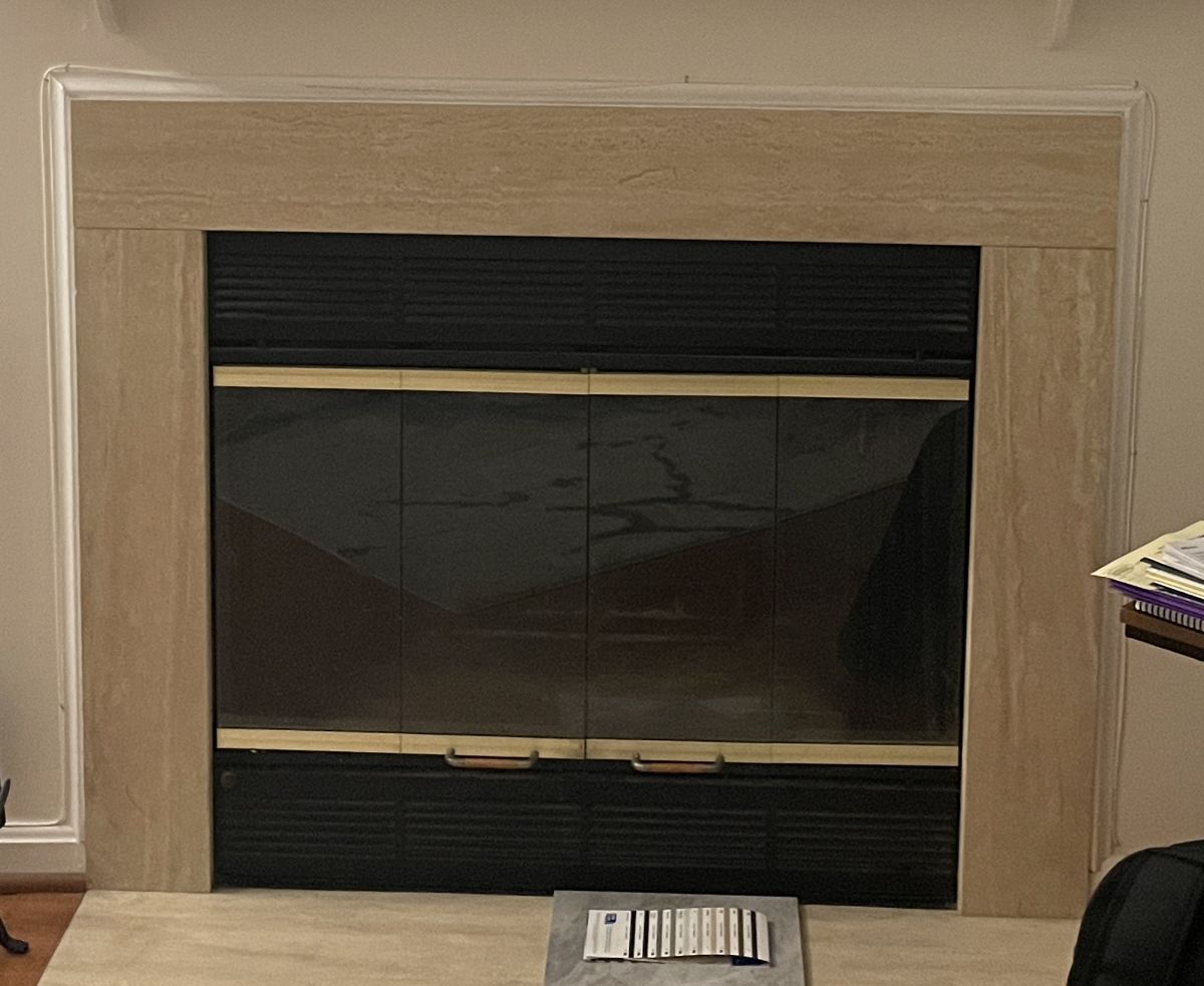 Customer Comments: This is a condo fireplace. Would like to demo the stone, replace doors, and will re-tile using the tile pcs sitting in front of the fireplace on the floor in the first picture.