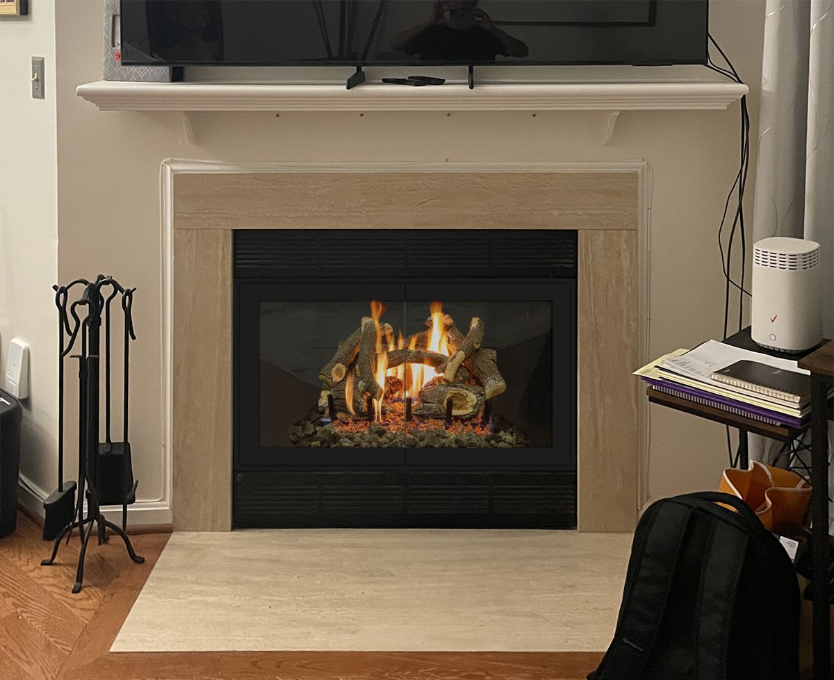 Option #3: Hearth Creations Modern-1 Sleek Steel Fireplace Door with No Visible Handles in Black. Available with Optional AirWash System for Buring Fires with Doors Closed. This door overlaps the existing door tracks. Shown with Grand Canyon American Weathered Oak Charred Gas Logs.