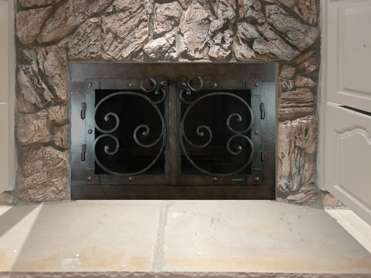 Option #7: Hand Crafted Scroll Wrought Iron Fireplace Door in Distressed Medium Bronze with Gray Glass and Gate Mesh Backup Doors.