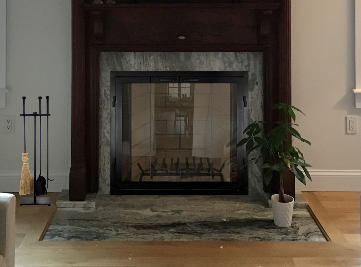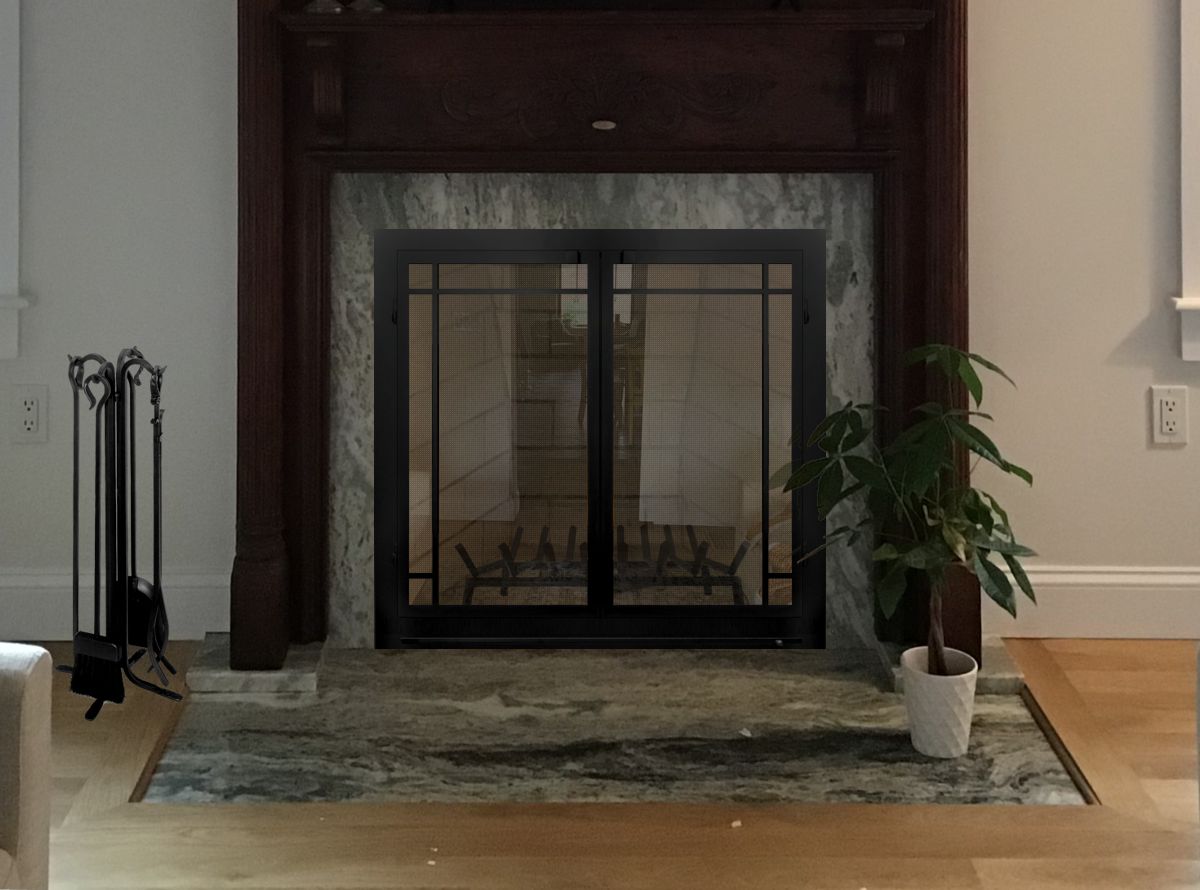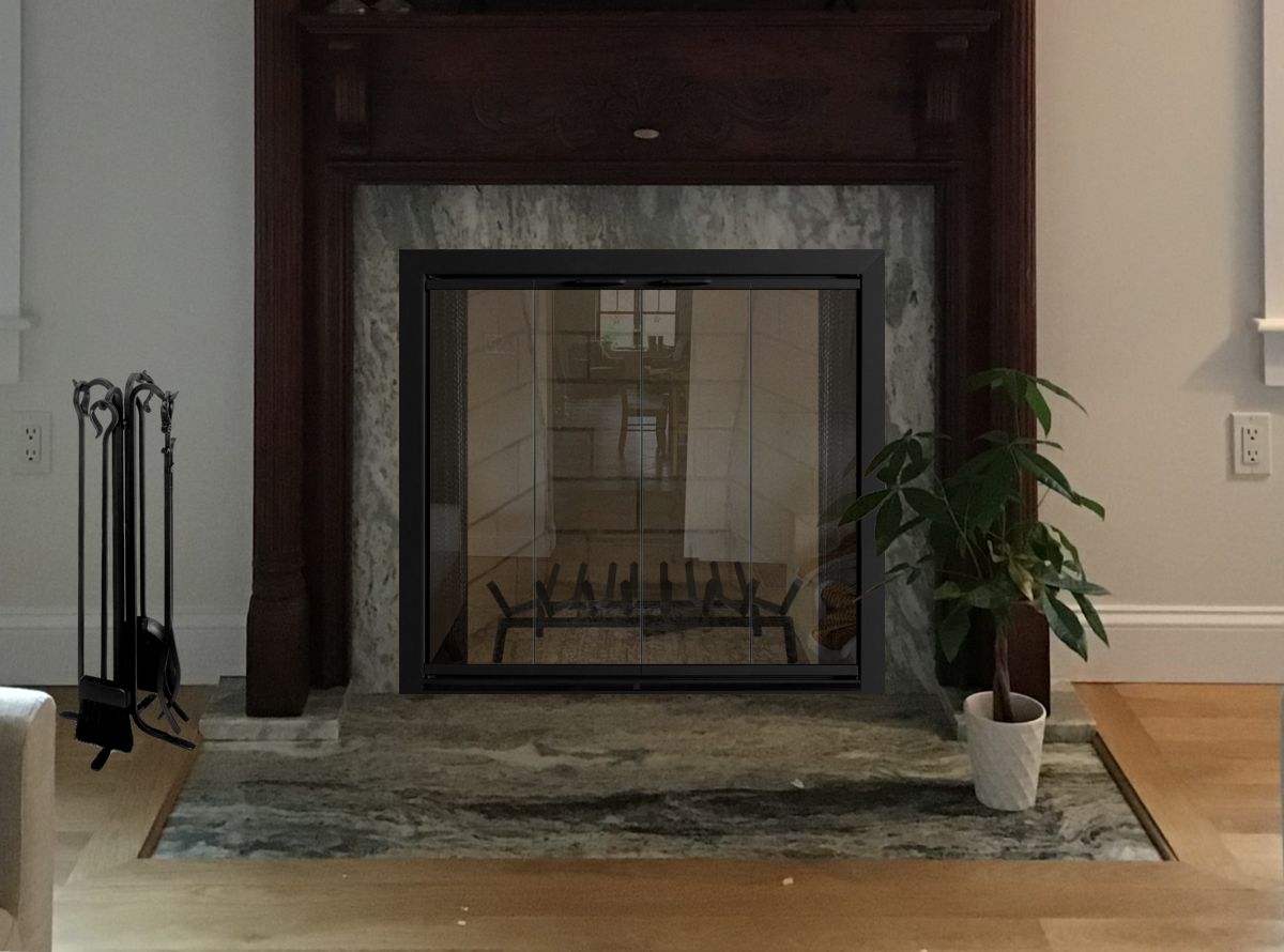 Option #1: PW Creekside Aluminum Bifold Fireplace Door in Black with Tempered or Ceramic Glass and Mesh Curtains. Shown with 18003 Fireplace Tools and Custom 3/4" Bar Iron Grate.