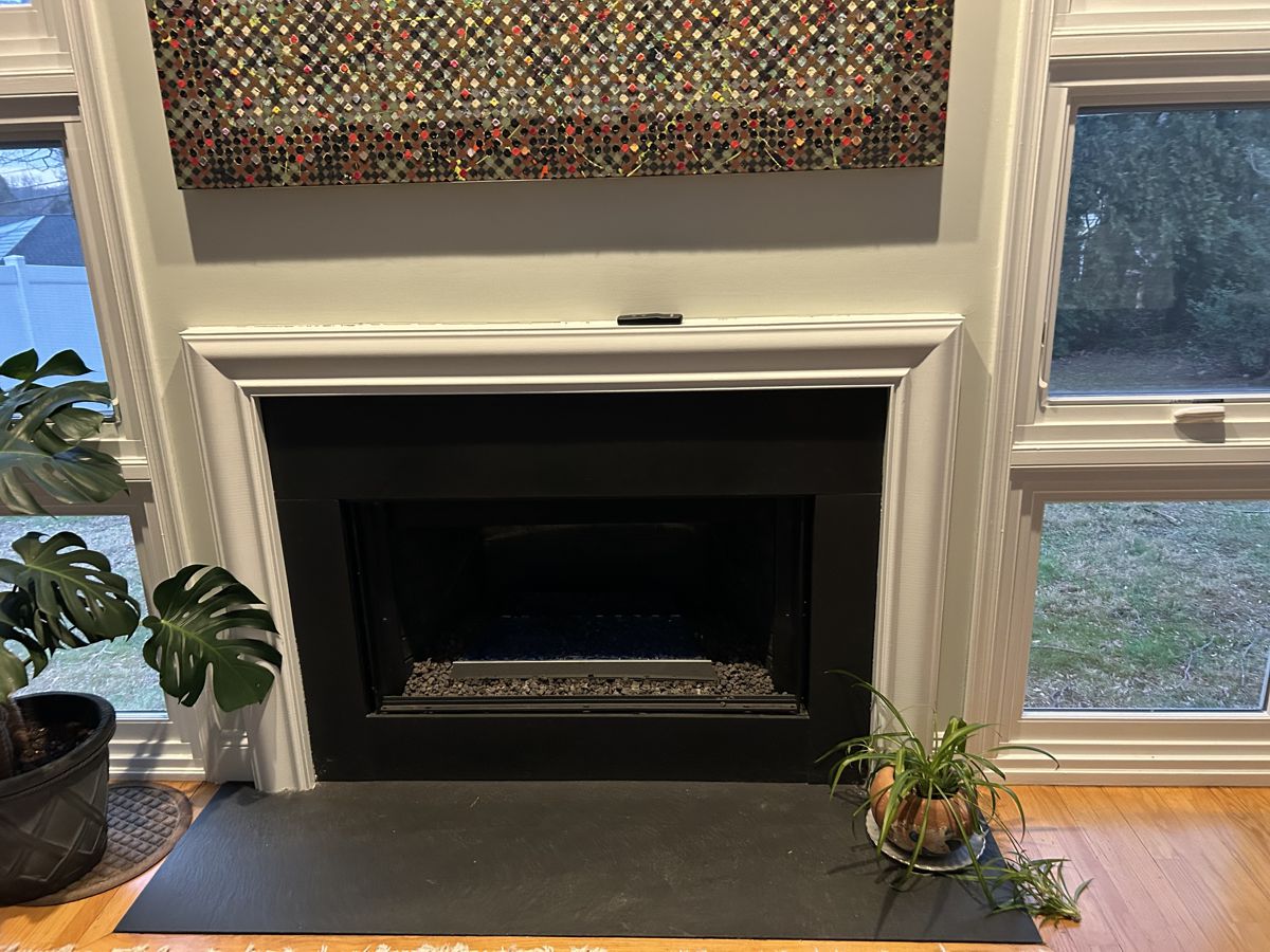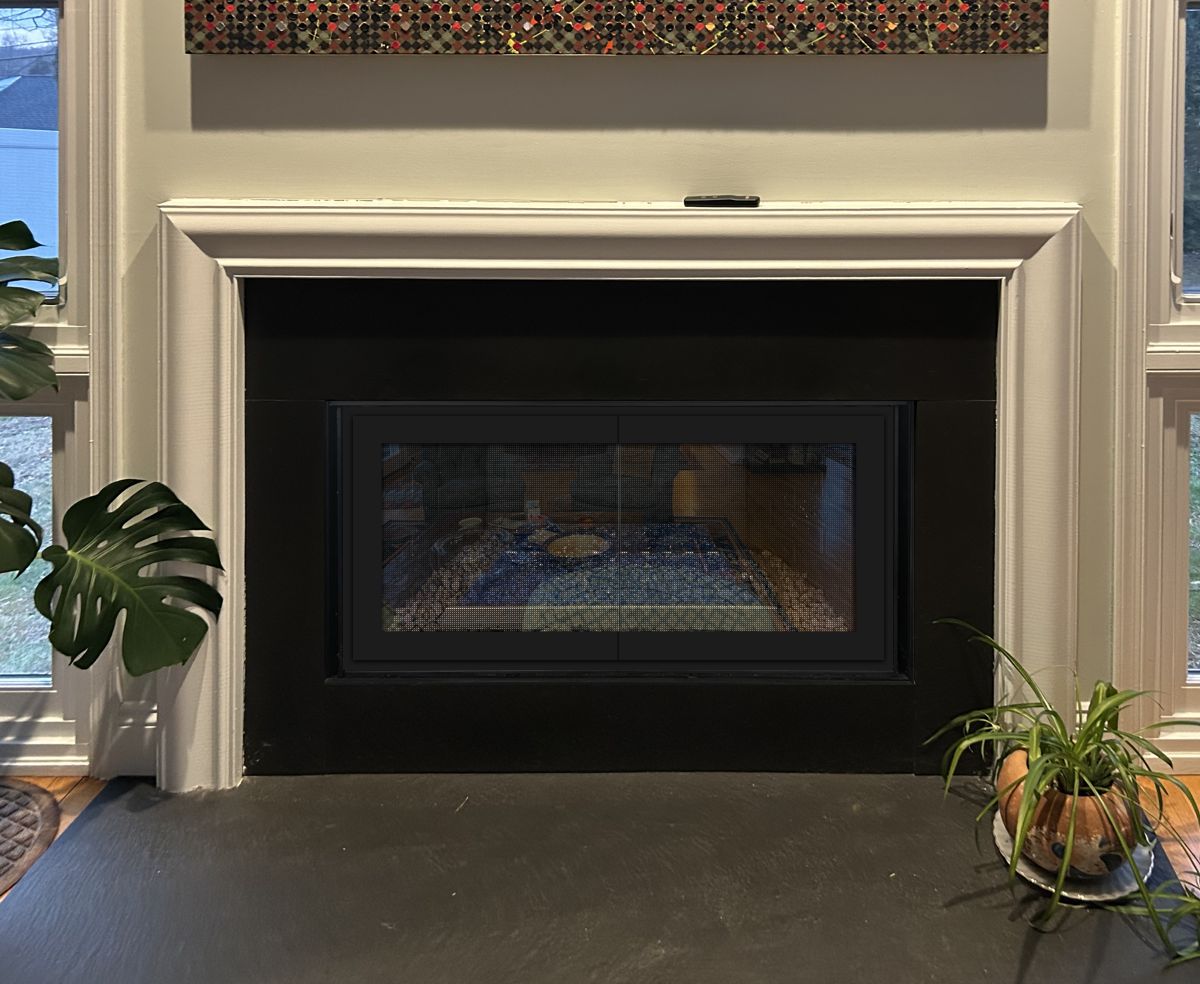 Option #3: Hearth Creations Modern-1 Sleek Steel Fireplace Door with Gas Log AirWash System and No Visible Handles in Black with Clear Tempered Glass and Single Gate Mesh Backup Door. Shown overlapping the slate with mesh louvers covering the slots.
