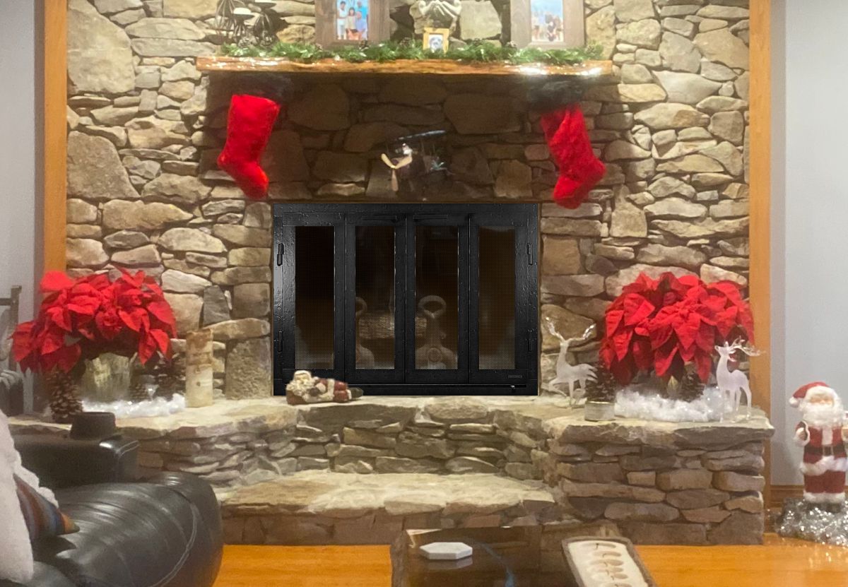 Option #3: Hand Crafted Wrought Iron Bifold Fireplace Door in Burnished Black with Tempered or Ceramic Glass and Heavy Duty Gate Mesh Backup Doors.