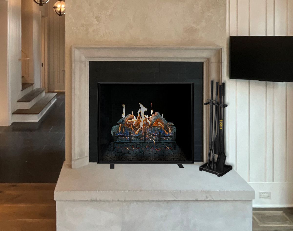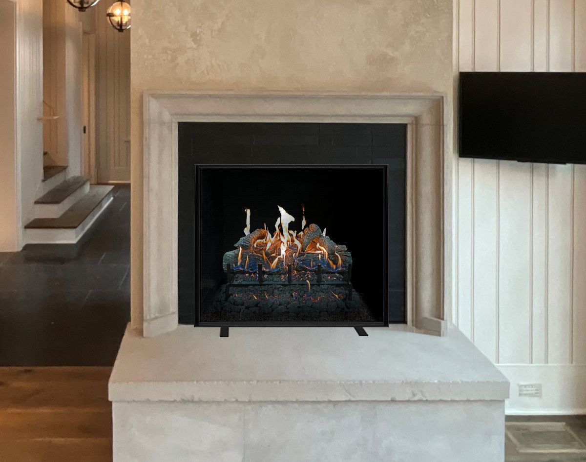 Option #2C: Hand Crafted Single Panel Fireplace Screen with Angle Frame and Recessed Screen in Burnished Black Wrought Iron. Shown with 24" Grand Canyon Lava Gas Logs with GloFire Technology.
