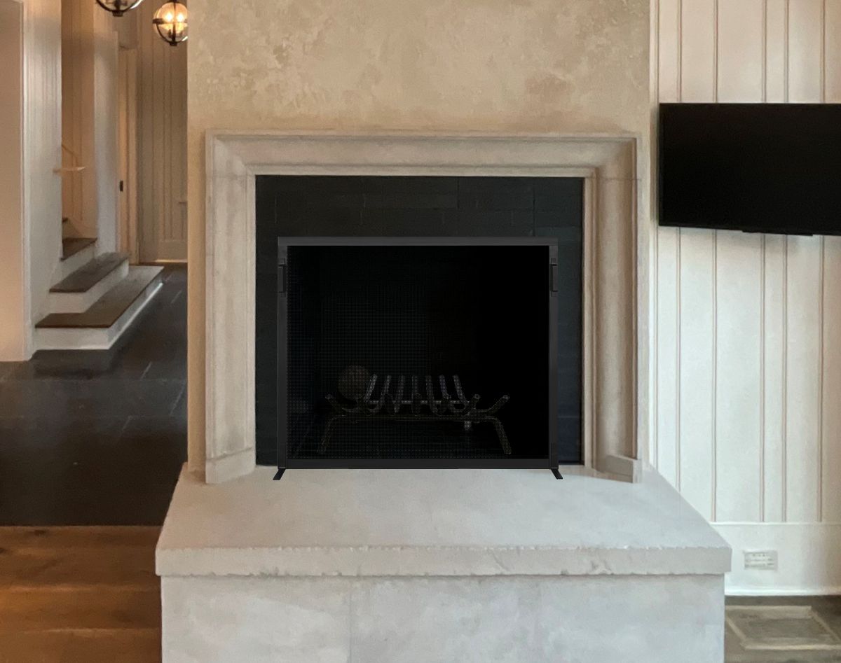 Option #2B: Hand Crafted Single Panel Fireplace Screen with Angle Frame and Recessed Screen in Satin Black. Shown with 26" Stock Grate.