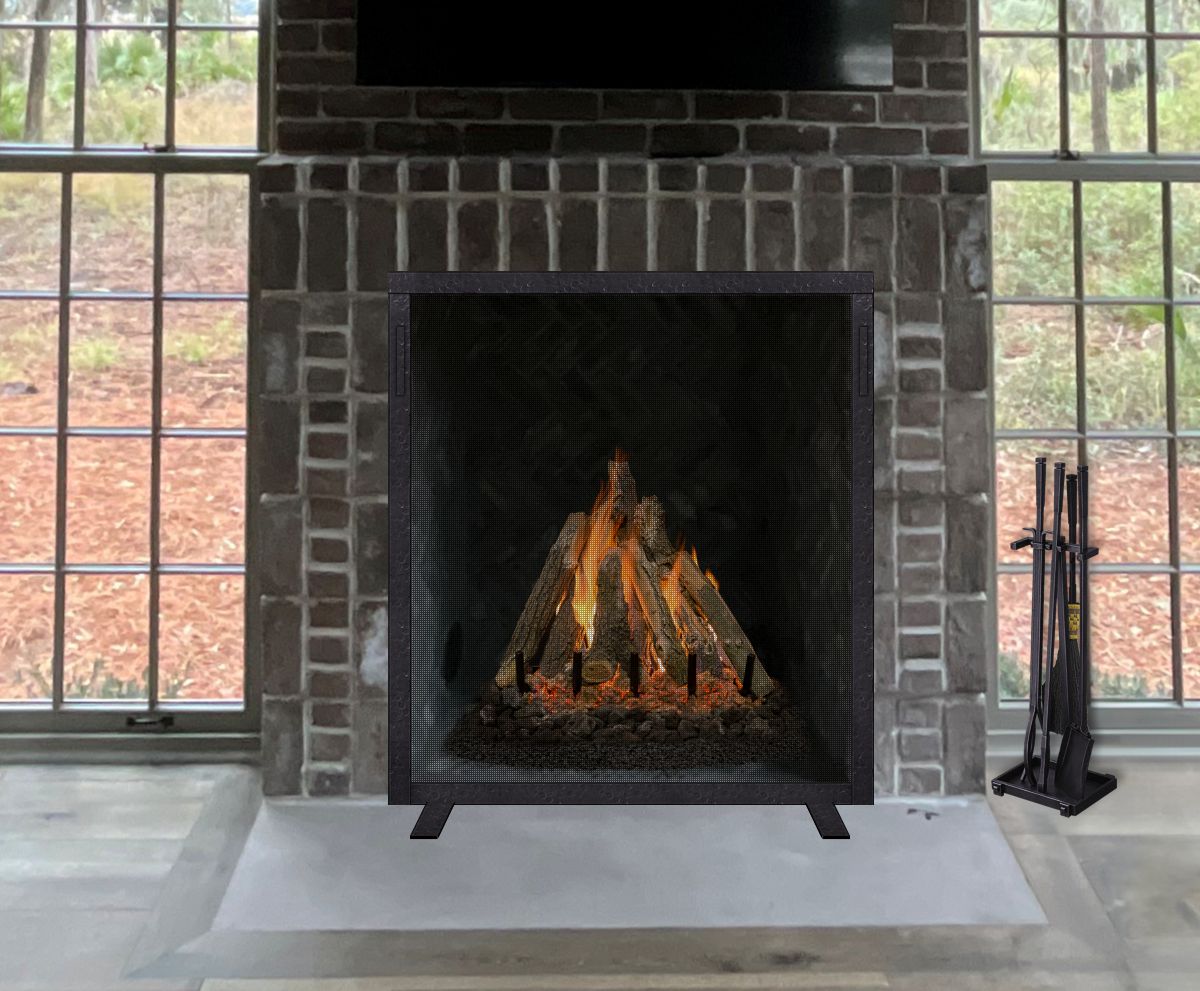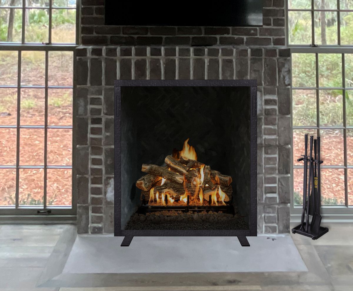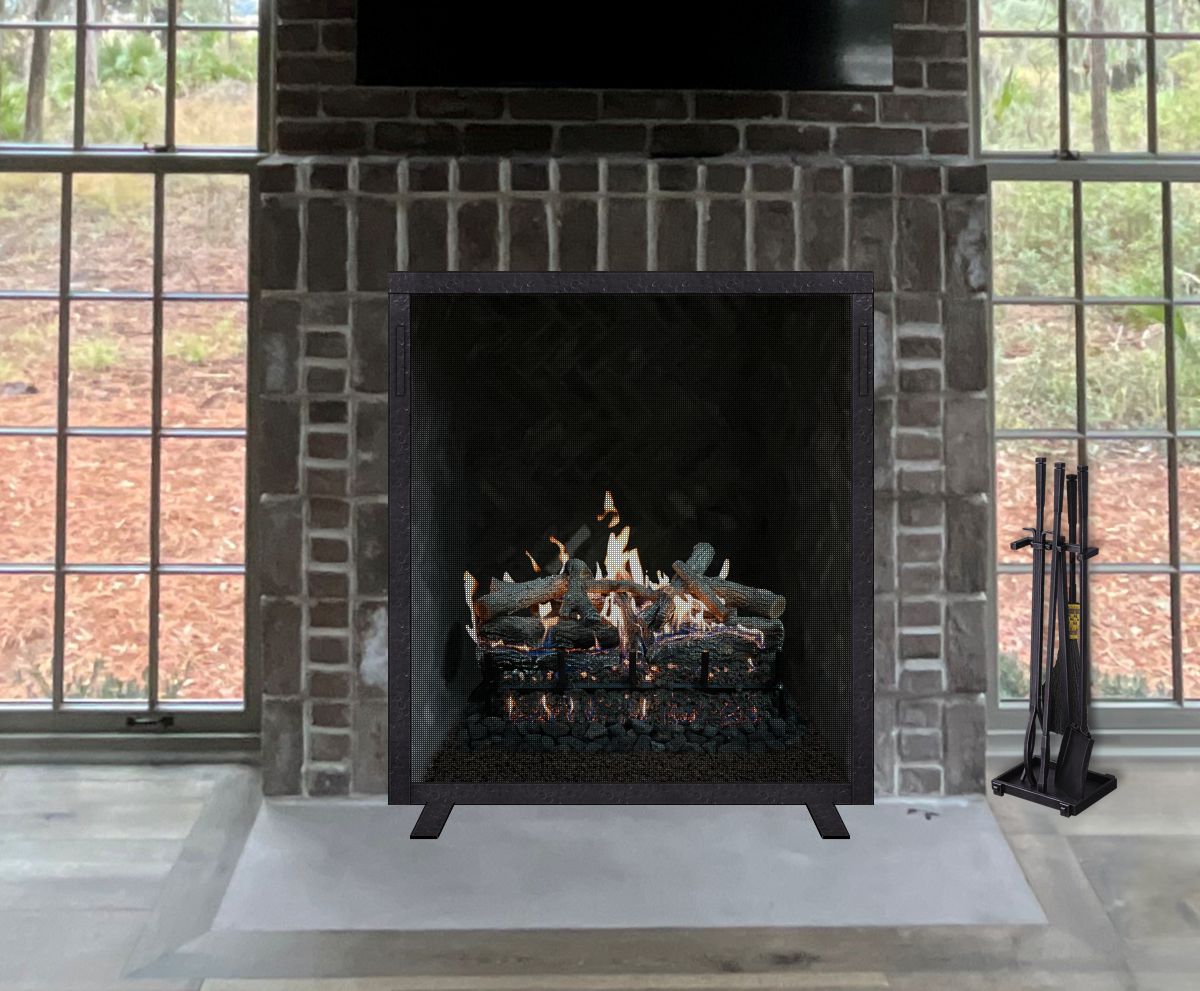 Option #6C: Hand Crafted Plain Wrought Iron Screen with 1 1/2" Frame, Flat Feet and Square Handles in Distressed Dark Bronze. Shown with Custom WI-T13 Wrought Iron Tools with Brush in Burnished Dark Bronze and 30" Grand Canyon Lava Series Gas Logs with GloFire Technology.