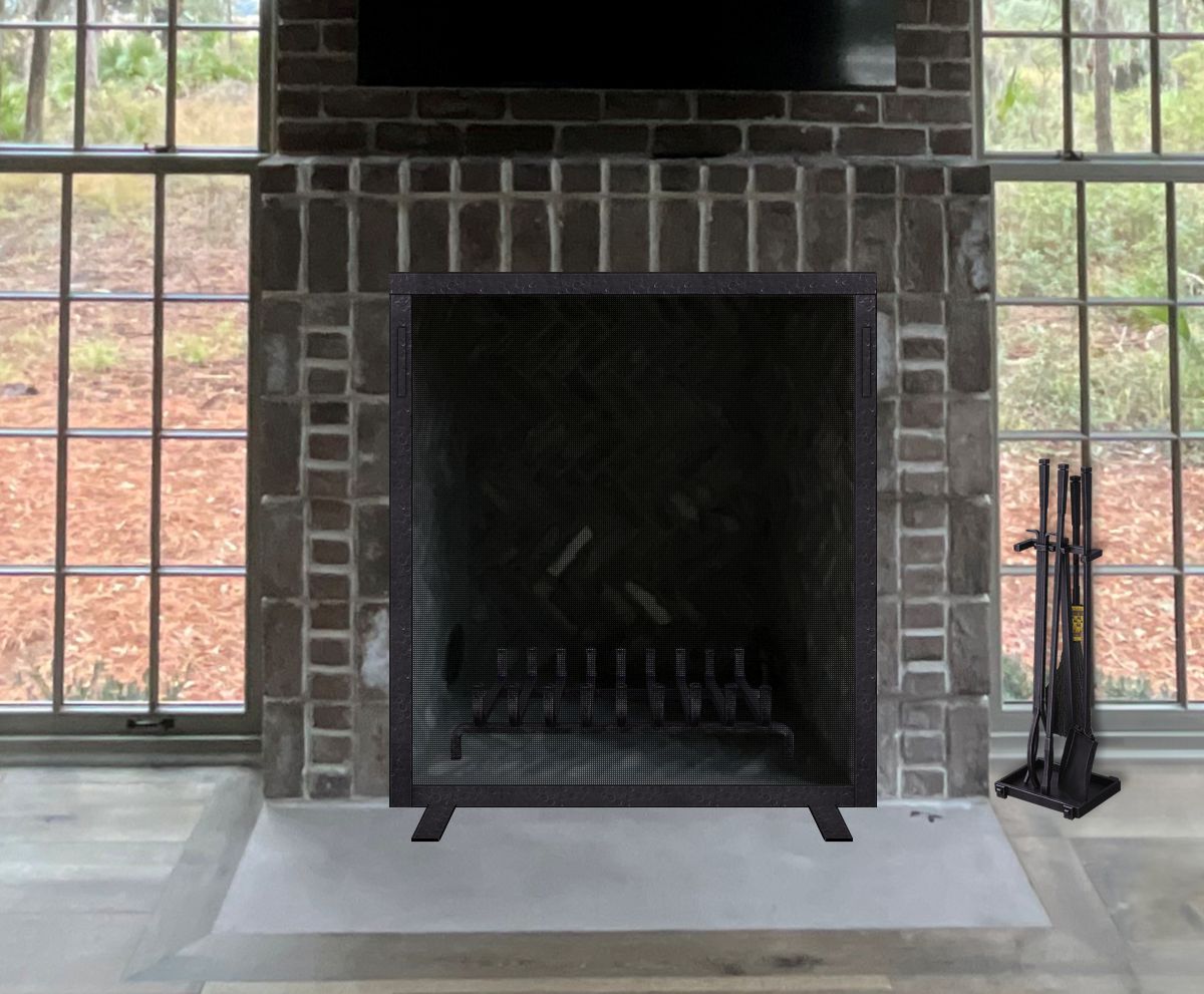Option #6: Hand Crafted Plain Wrought Iron Screen with 1 1/2" Frame, Flat Feet and Square Handles in Distressed Dark Bronze. Shown with Custom WI-T13 Wrought Iron Tools with Brush in Burnished Dark Bronze and Custom Wrought Iron Grate with 1" Square Bars in Burnished Dark Bronze.
