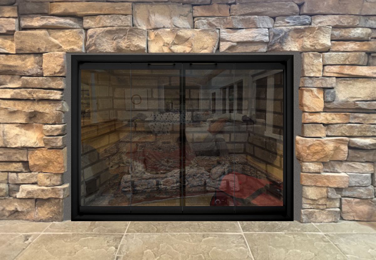 Option #3: PW Pendleton Aluminum Bifold Fireplace Door with Detachable Surround Trim in Black with Clear Glass and Single Gate Mesh Backup Door. The detachable surround trim gets installed behind the stone and the door overlaps the trim opening. (See trim example below).