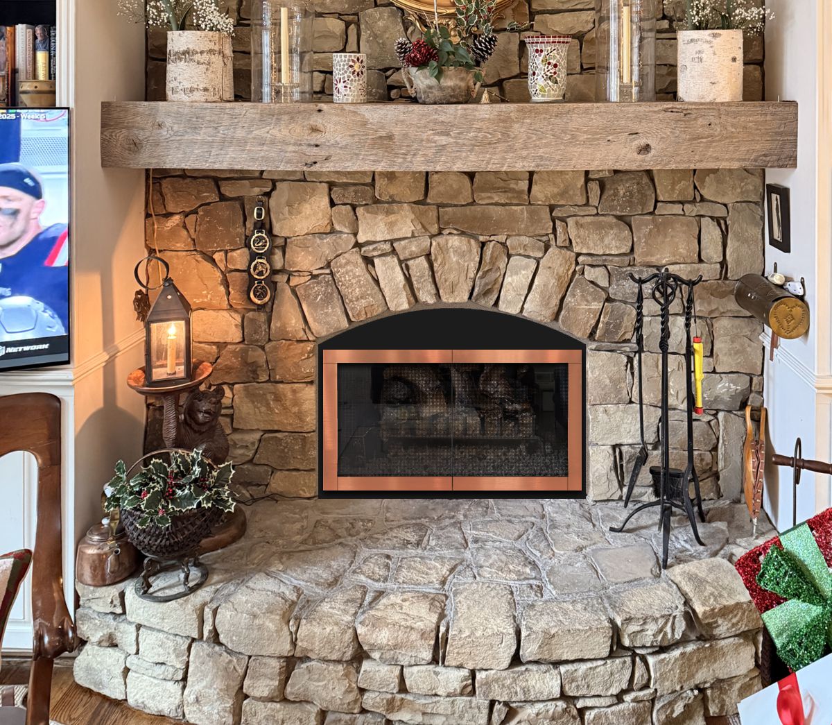 Our Comments: Here are some glass doors that can be custom made to fit your arched stone fireplace. A template will be required (see instructions below). We will make the door about 1/4" smaller than the innermost part of the template so it fits comfortably. You will then need to fill the gaps between the stones and the frame with mortar. I can offer advice for installation when the time comes.