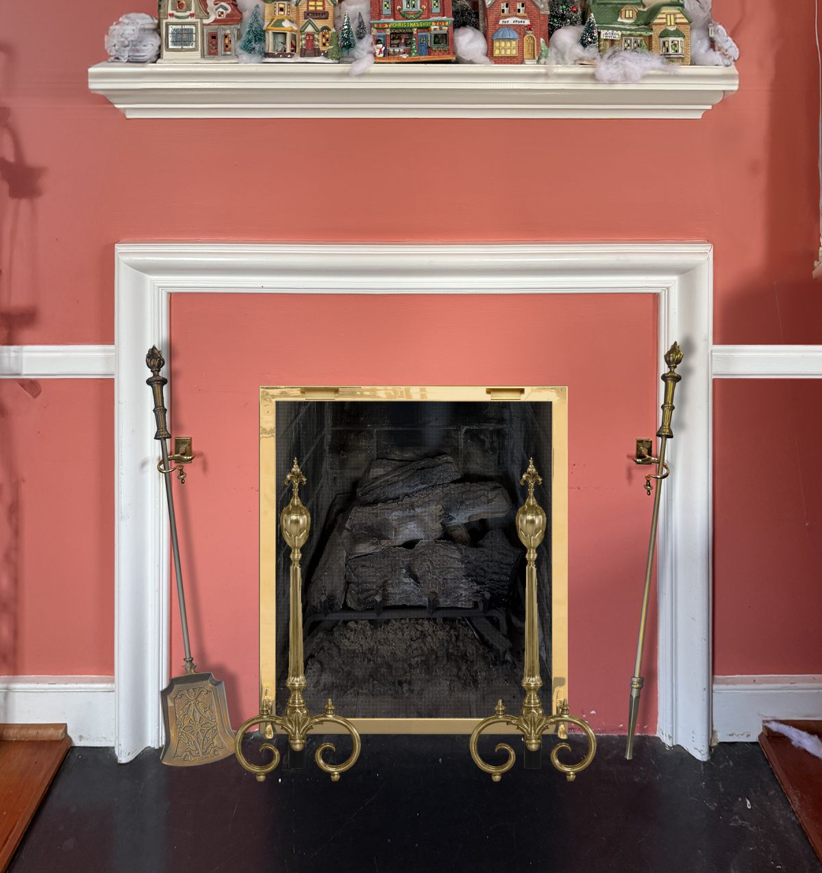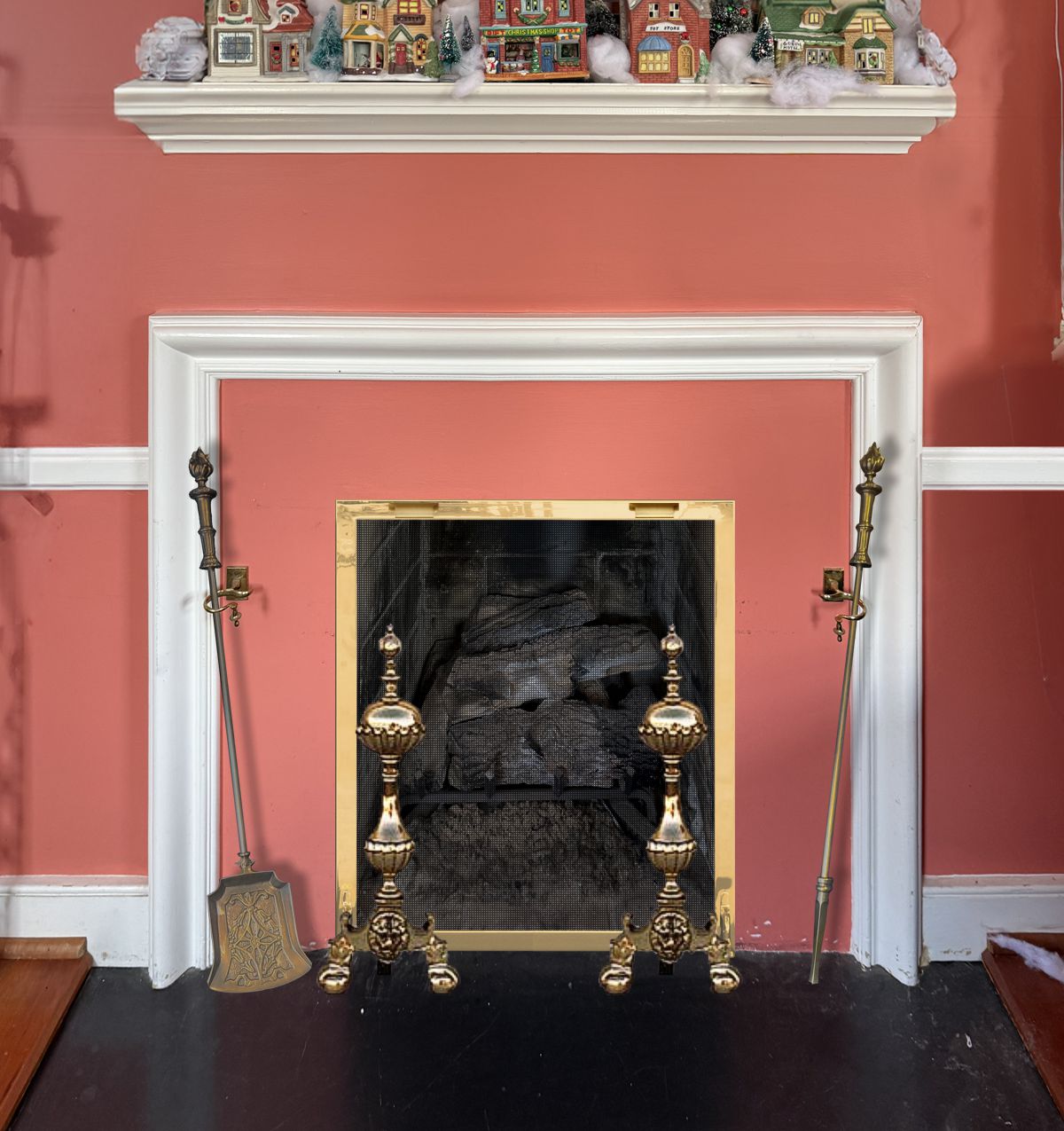 This solid brass free standing screen is custom made to fit your fireplace. The screen is made to overlap the opening 3/4" on the top and each side. I am showing this with several of the Closeout Special andirons I have that I'm selling for about half the original price. The tools I am showing are Antique Reproductions of tools that were used specifically with tool jams very similar to the ones you already have, so they are perfect for your application. I only have the one pair.