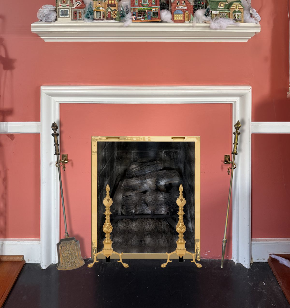 Option #4: Custom Solid Brass Single Panel Fireplace Screen in Polished Brass. Shown with Closeout Special* Antique Reproduction Poker and Shovel in Olde English and AR-AN11S 26" Tall Antique Reproduction Catherine Andirons in Hand Polished Brass.