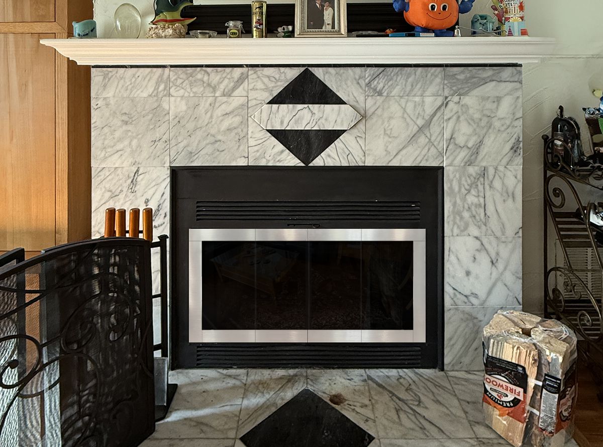 Our Comments: The damper control just above the opening limits the doors you can use to those that can be made to fit inside the fireplace. Below are a few choices that will work nicely. The first option is the least expensive, but reqires drilling into the metal inside for installation. The other options all use a Quick and Easy pressure mount systems that do not require drilling.