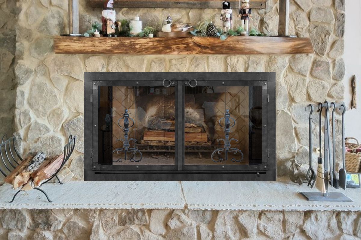 Hand forged by a blacksmith from 1/4" thick solid wrought iron with heavy duty gasketed doors for a tighter seal and maximum draft reduction. Not only are these built to be used, they take on a more rugged natural look for those who appreciate craftsmanship and tasteful details. The forging process produces a unique texture that you cannot get with laser cut steel and there are added hammered textures that can be for a more rustic applications. These doors are often used for extremely large fireplaces because of their heavy duty solid frame and hinges. They are commonly ordered with ceramic glass for buring hot fires with the doors closed.