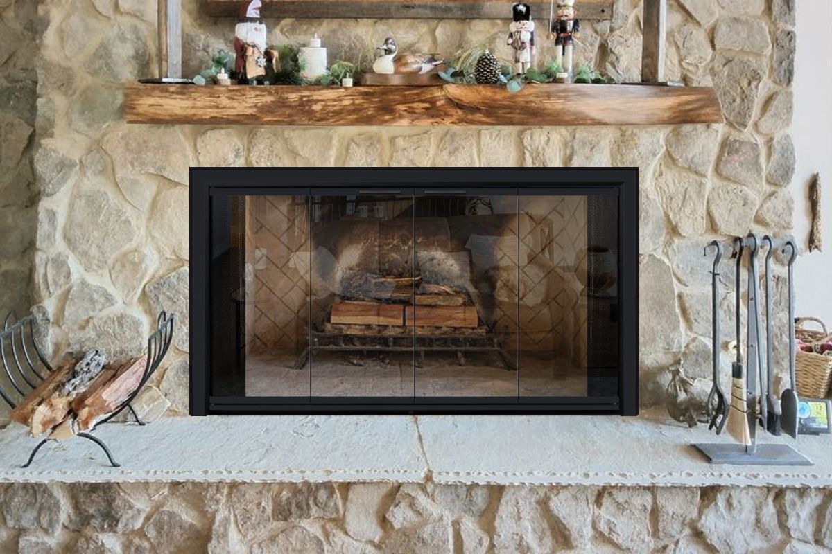 Option #1: PW Breckenridge Aluminum Fullview Bifold Fireplace Door in Black with Tempered or Ceramic Glass and Mesh Curtains.