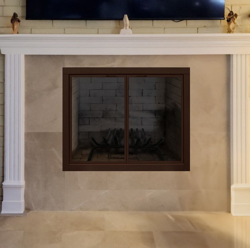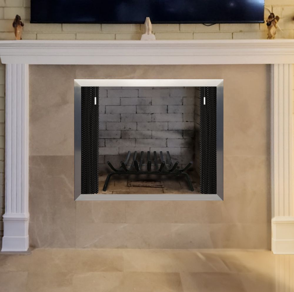 If you are planning on burning anything in your fireplace, you need to have mesh behind the glass so you can burn a fire with the doors open. You can chooe between gate mesh backup doors and sliding mesh curtains. Functionally, gate mesh performs the best as the wire has smaller holes that sparks cannot get through. Aesthetically, mesh curtains may be preferred because they do not have a vertical center frame that obstructs the view of the fire. When you are not using the fire or you want a complete unobstructed view, they do not stick out like gate mesh doors when they are opened.