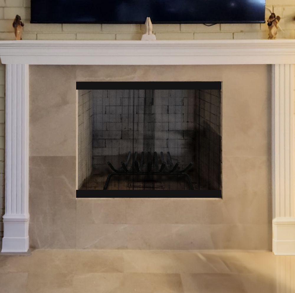 Option #3: Fireplace Mesh Curtains with Top and Bottom Bar in Black. Other finishes are available.