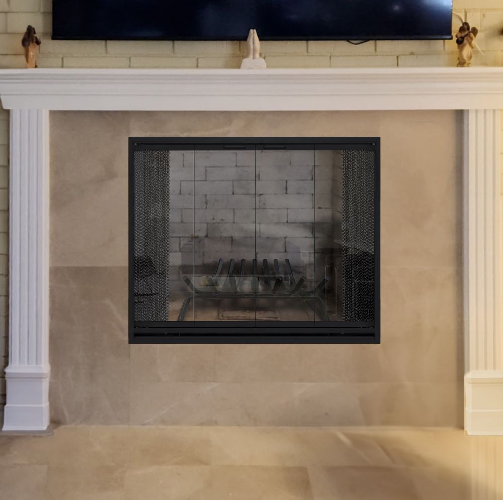Option #1: Pendleton Aluminum Bifold Fireplace Door in Black with Tempered or Ceramic Glass and Mesh Curtains.