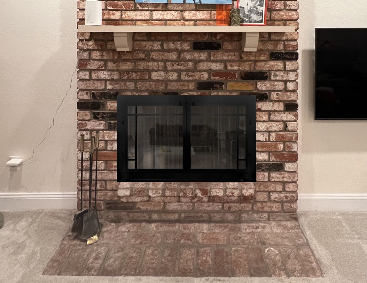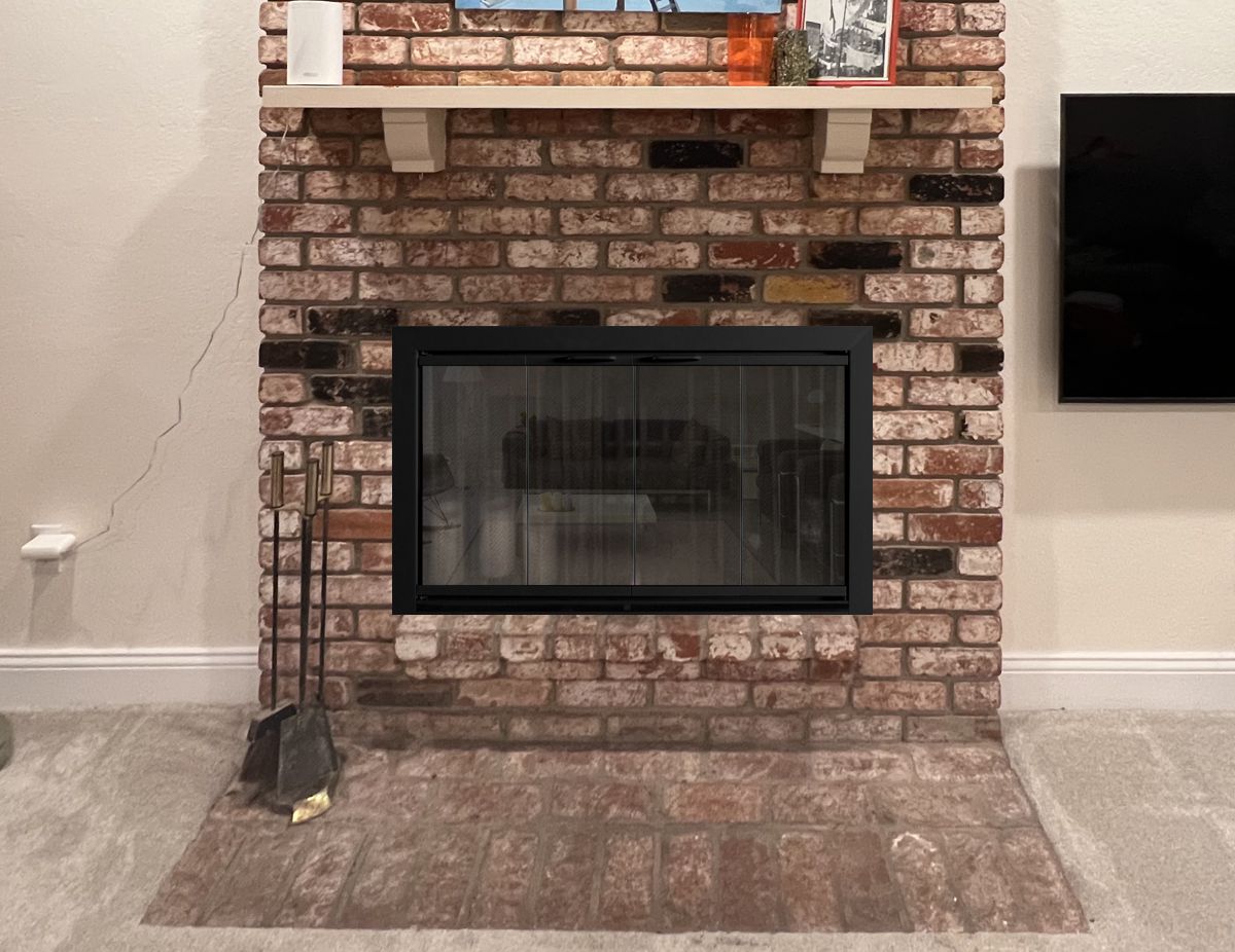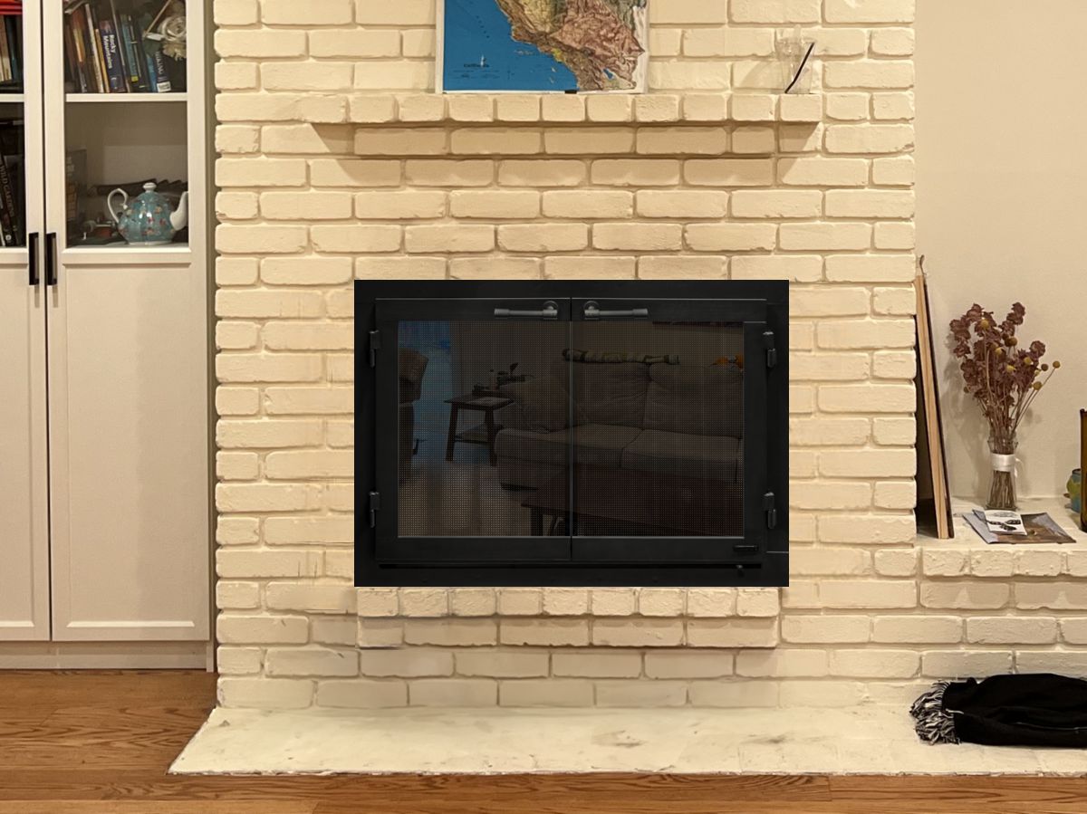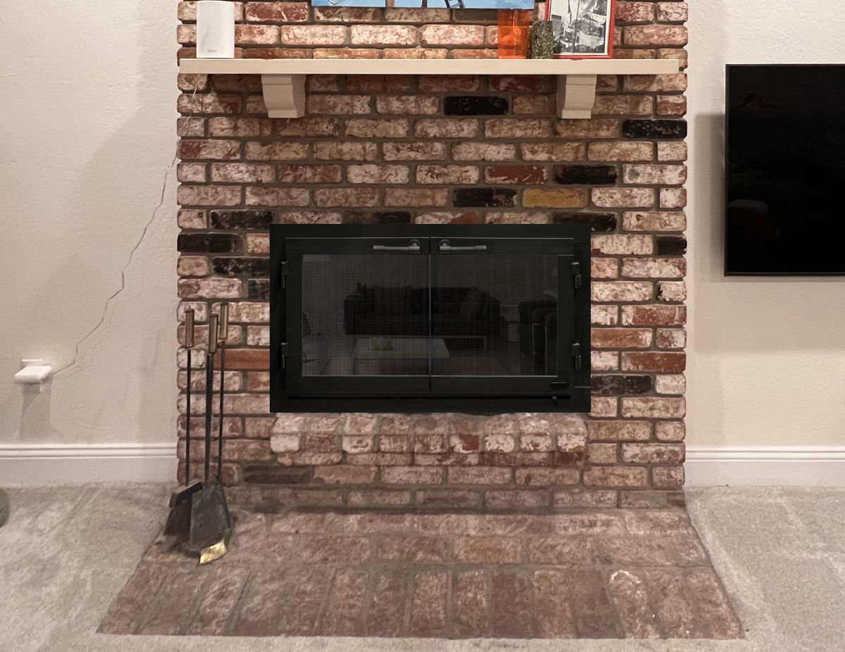 Customer Comments: We have a double-sided fireplace that faces the family room (IMG_3248) and the living room (IMG_1076). I want to replace the doors / metal framing around the brick opening. Currently, we have metal mesh curtains on the family room side, and glass folding panels on the living room side. I was reading your website and saw the glass doors on both sides are recommended. The brick opening is 24.5" wide by 40" tall. We're redoing the mantels, so I'm looking for just simple black metal doors.