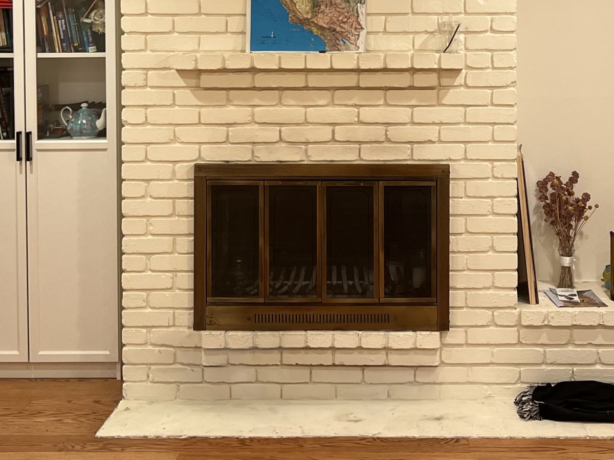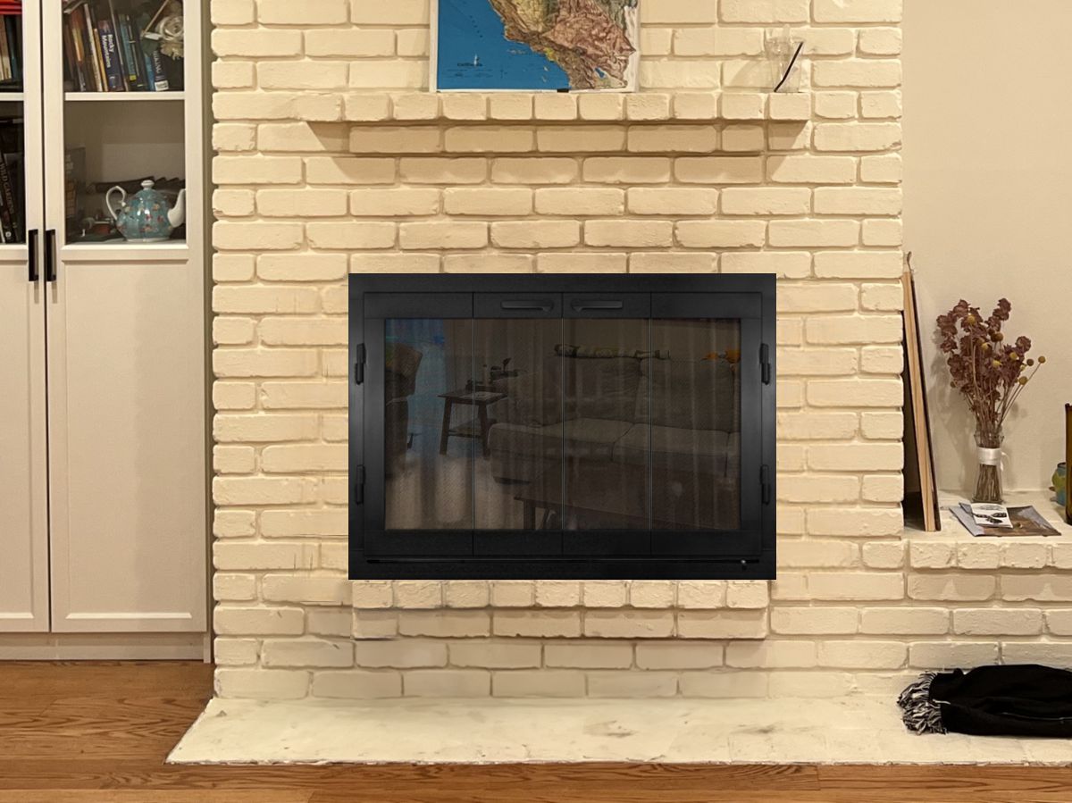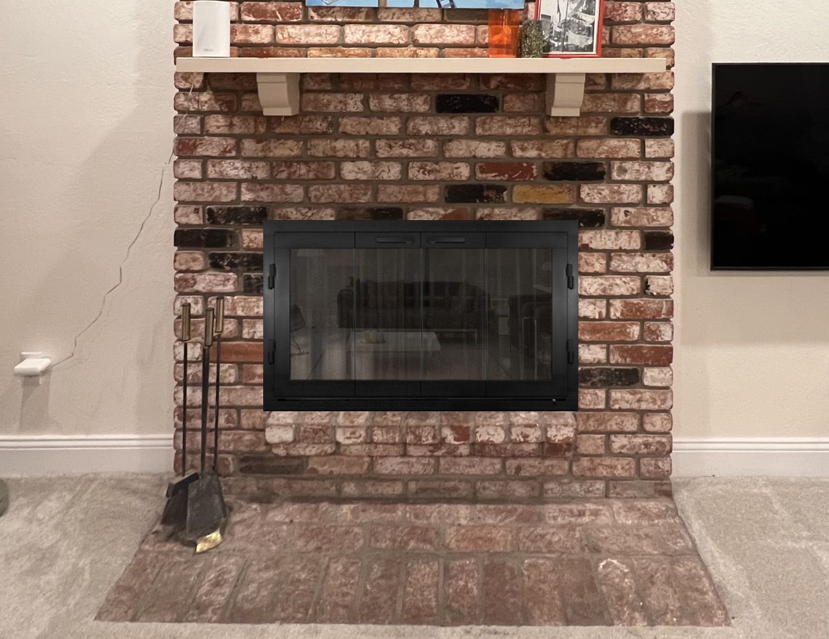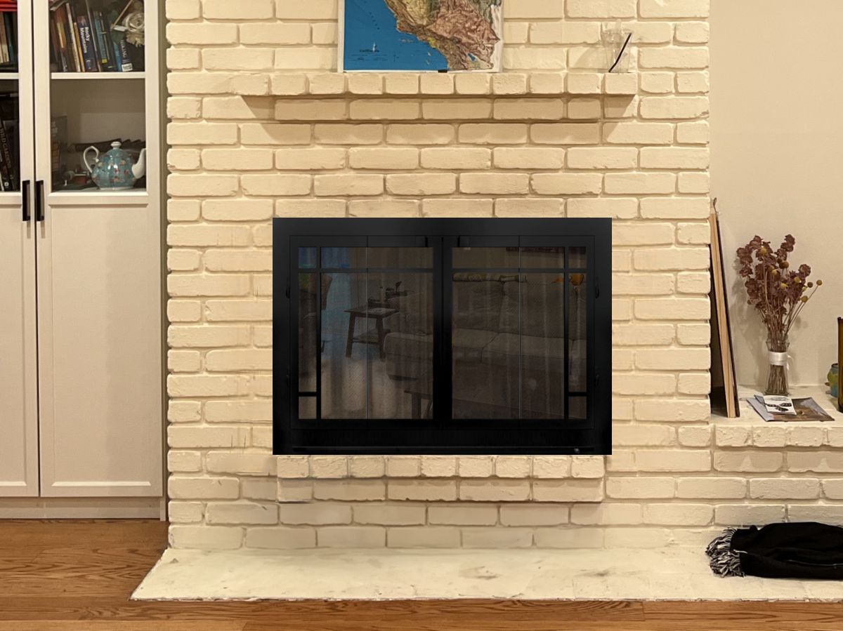 Customer Comments: We have a double-sided fireplace that faces the family room (IMG_3248) and the living room (IMG_1076). I want to replace the doors / metal framing around the brick opening. Currently, we have metal mesh curtains on the family room side, and glass folding panels on the living room side. I was reading your website and saw the glass doors on both sides are recommended. The brick opening is 24.5" wide by 40" tall. We're redoing the mantels, so I'm looking for just simple black metal doors.