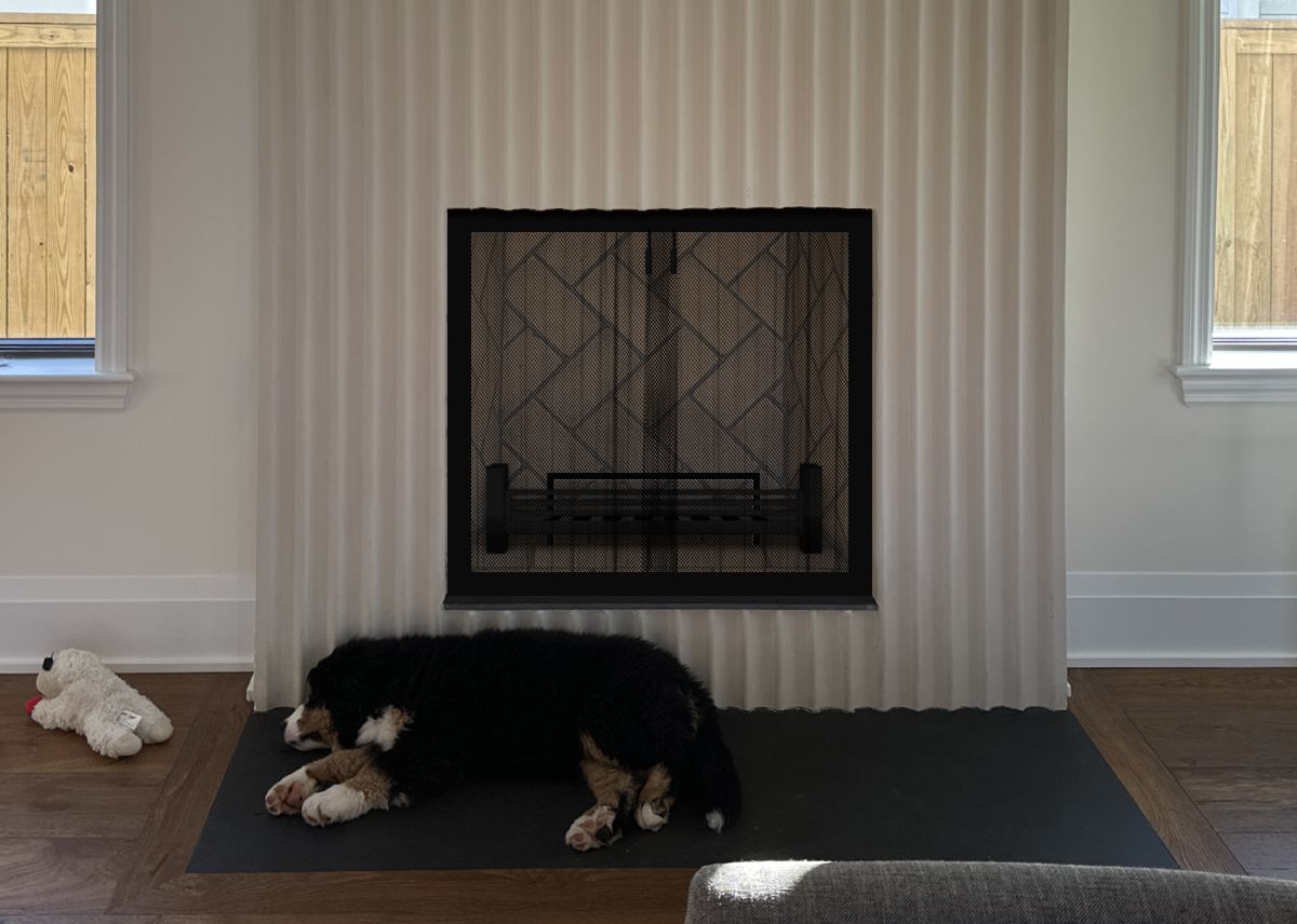 Option #2: Fireplace Framed Mesh Curtains in Black with I-Beam Track and Roller System. Shown with High-End Custom Grill Grate.