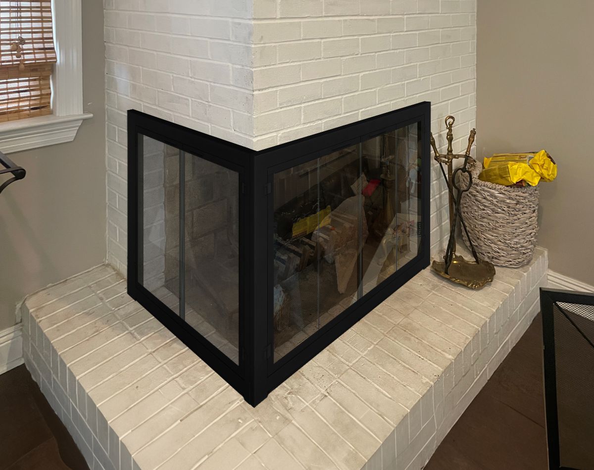 Option #1: Design Specialties Stiletto Aluminum BCorner Fireplace Door with Bifold Doors and Gate Mesh Backup Doors on the Front Side and a Fixed Glass Pane on the Left.