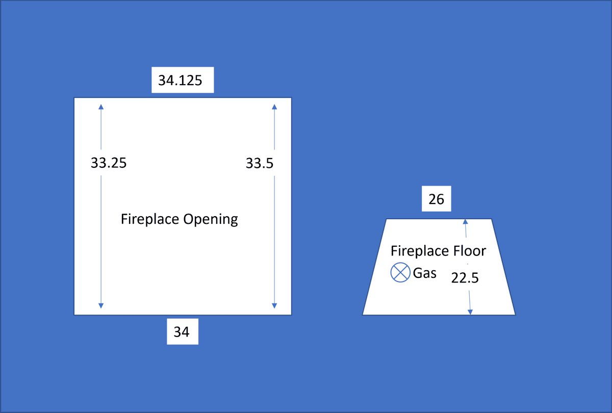 Fireplace Opening: 34 1/16" W (Top) x 34" W (Bottom) x 33 1/4" H (Left) x 33 1/2" H (Right) x 22 1/2" D x 26" W (Back)