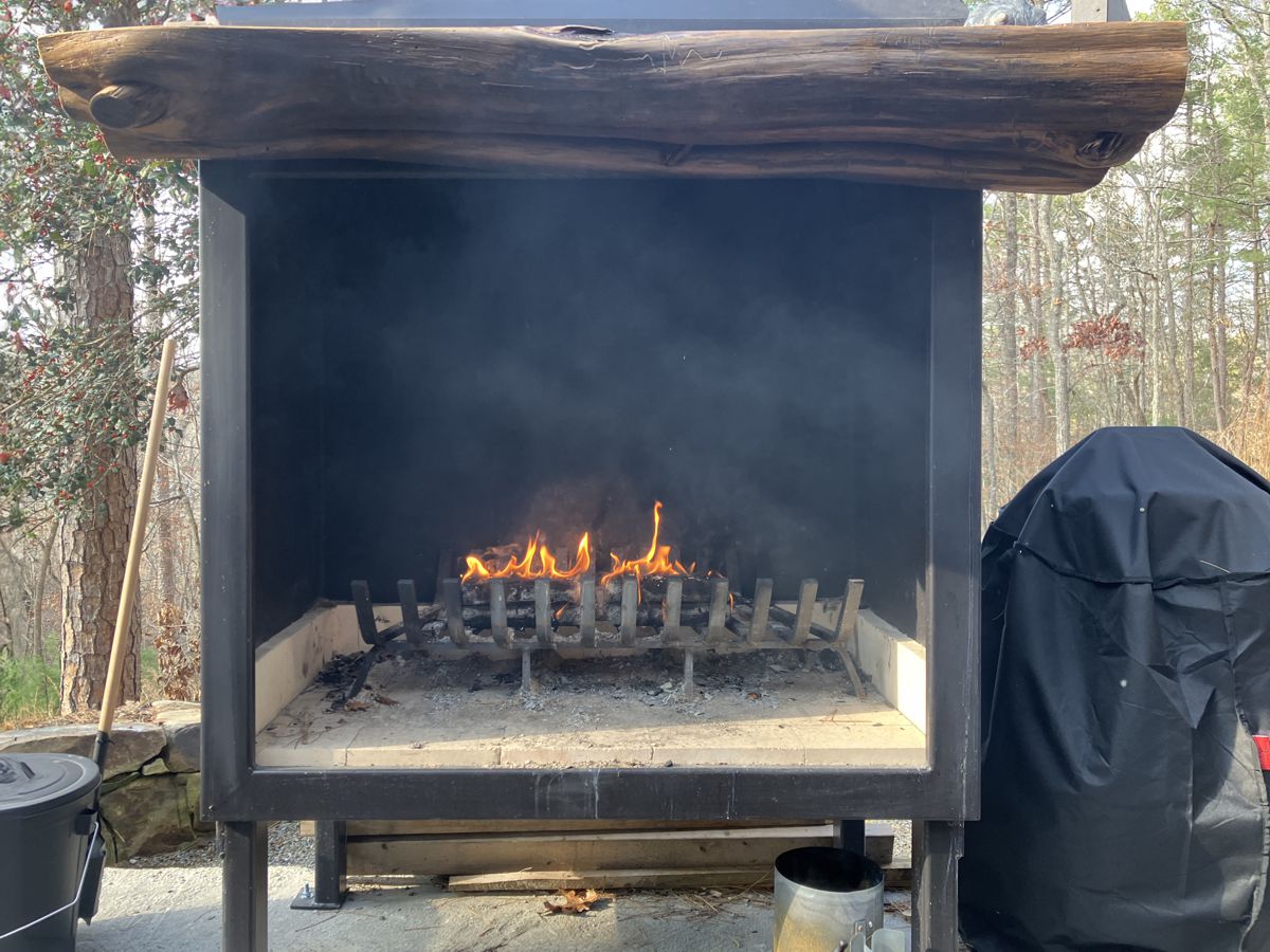Aluminum is an excellent material for fireplace doors because it does not rust like steel and can handle high temperatures when treated with powder coated finishes. Although the hinges and hardware are not made specifically for use outdoors, it is the most affordable option.