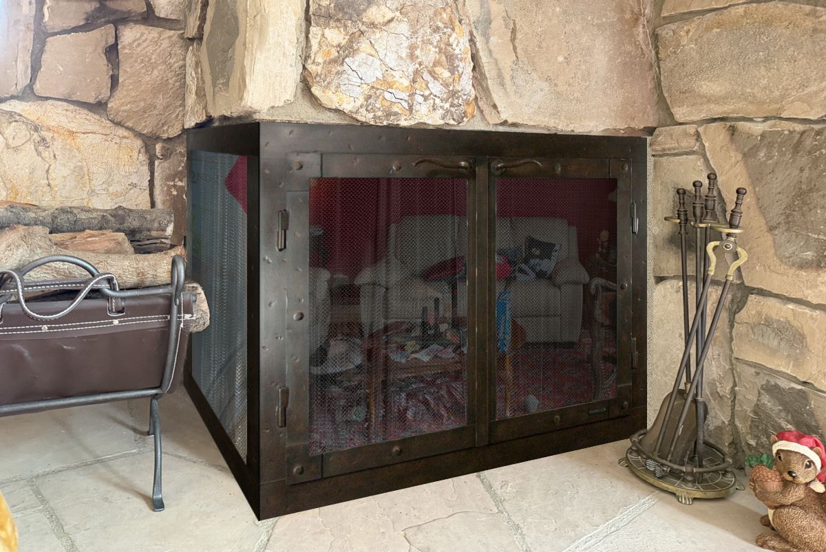 Option #3 Hand Crafted Olde World Wrought Iron Cabinet Fireplace Door in Hammered Medium Bronze with Tempered or Ceramic Glass and Heavy Duty Gate Mesh Backup Doors (Short Side is Fixed)