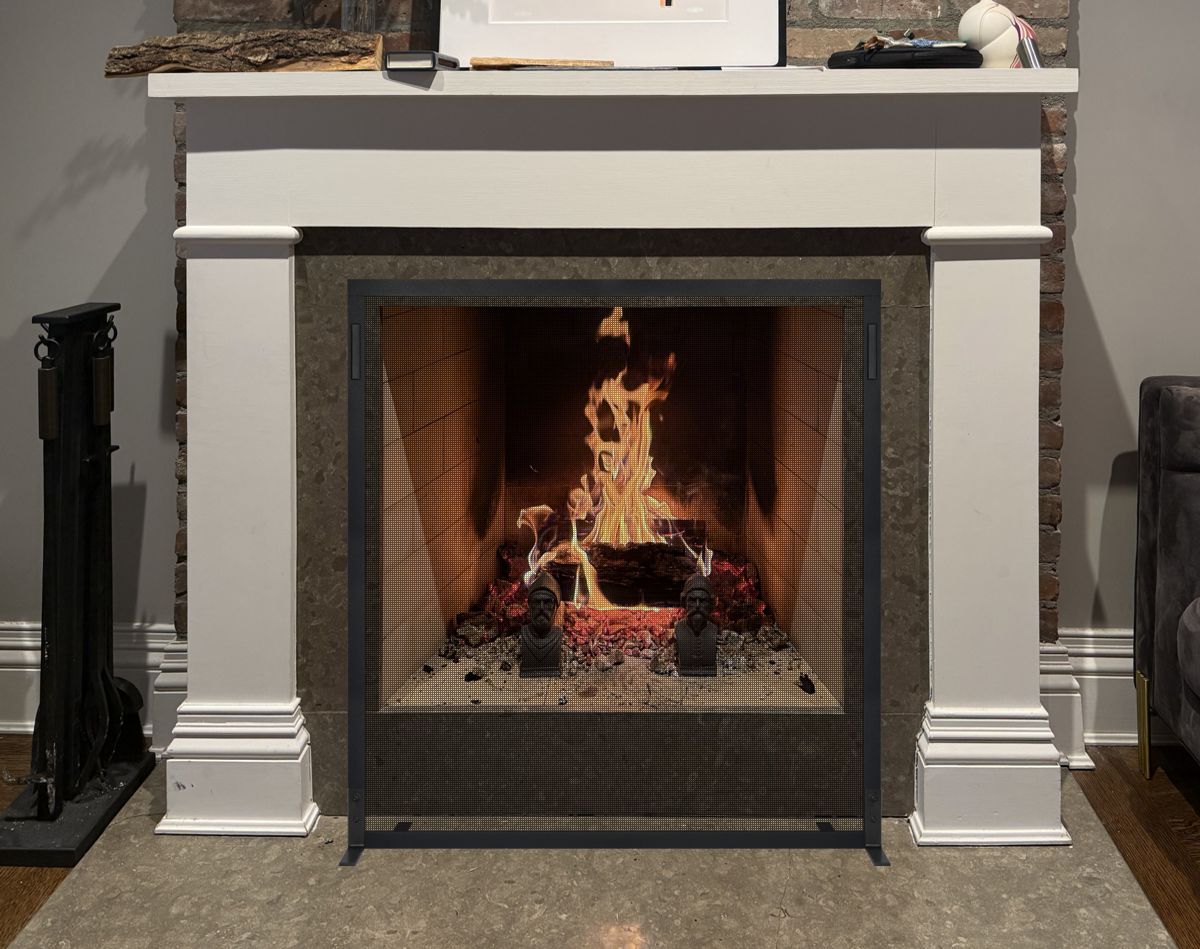 If you are planning on burning anything in your fireplace, you need to have mesh behind the glass so you can burn a fire with the doors open. You can chooe between gate mesh backup doors and sliding mesh curtains. Functionally, gate mesh performs the best as the wire has smaller holes that sparks cannot get through. Aesthetically, mesh curtains may be preferred because they do not have a vertical center frame that obstructs the view of the fire. When you are not using the fire or you want a complete unobstructed view, they do not stick out like gate mesh doors when they are opened.