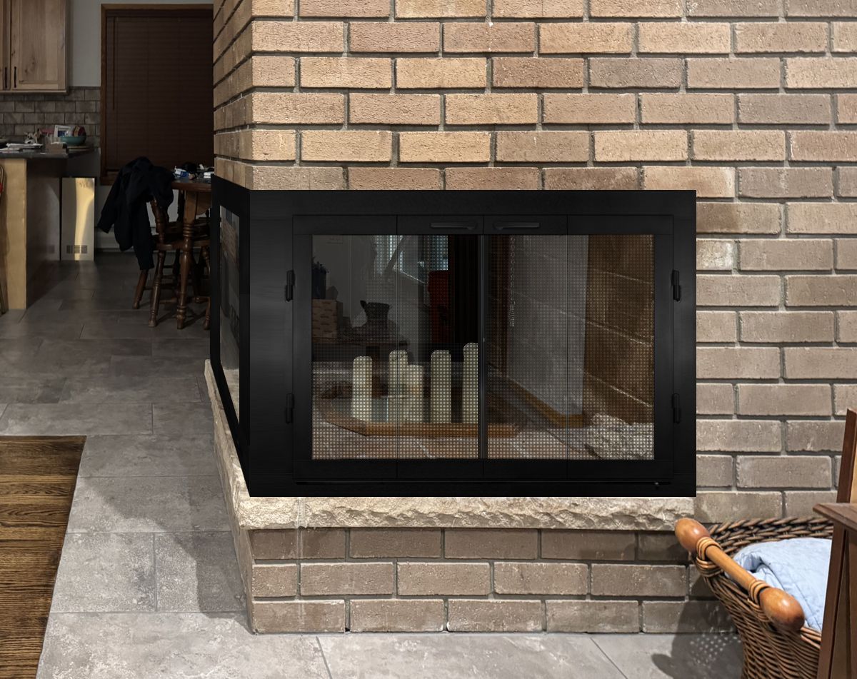 If you are planning on burning anything in your fireplace, you need to have mesh behind the glass so you can burn a fire with the doors open. You can chooe between gate mesh backup doors and sliding mesh curtains. Functionally, gate mesh performs the best as the wire has smaller holes that sparks cannot get through. Aesthetically, mesh curtains may be preferred because they do not have a vertical center frame that obstructs the view of the fire. When you are not using the fire or you want a complete unobstructed view, they do not stick out like gate mesh doors when they are opened.