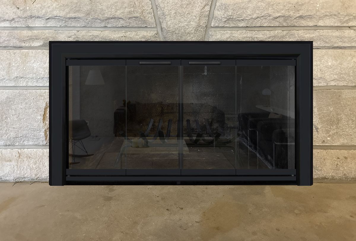 Option #2: PW Breckenridge Aluminum Bifold Fireplace Door in Black with Tempered or Ceramic Glass and Gate Mesh Backup Doors.
