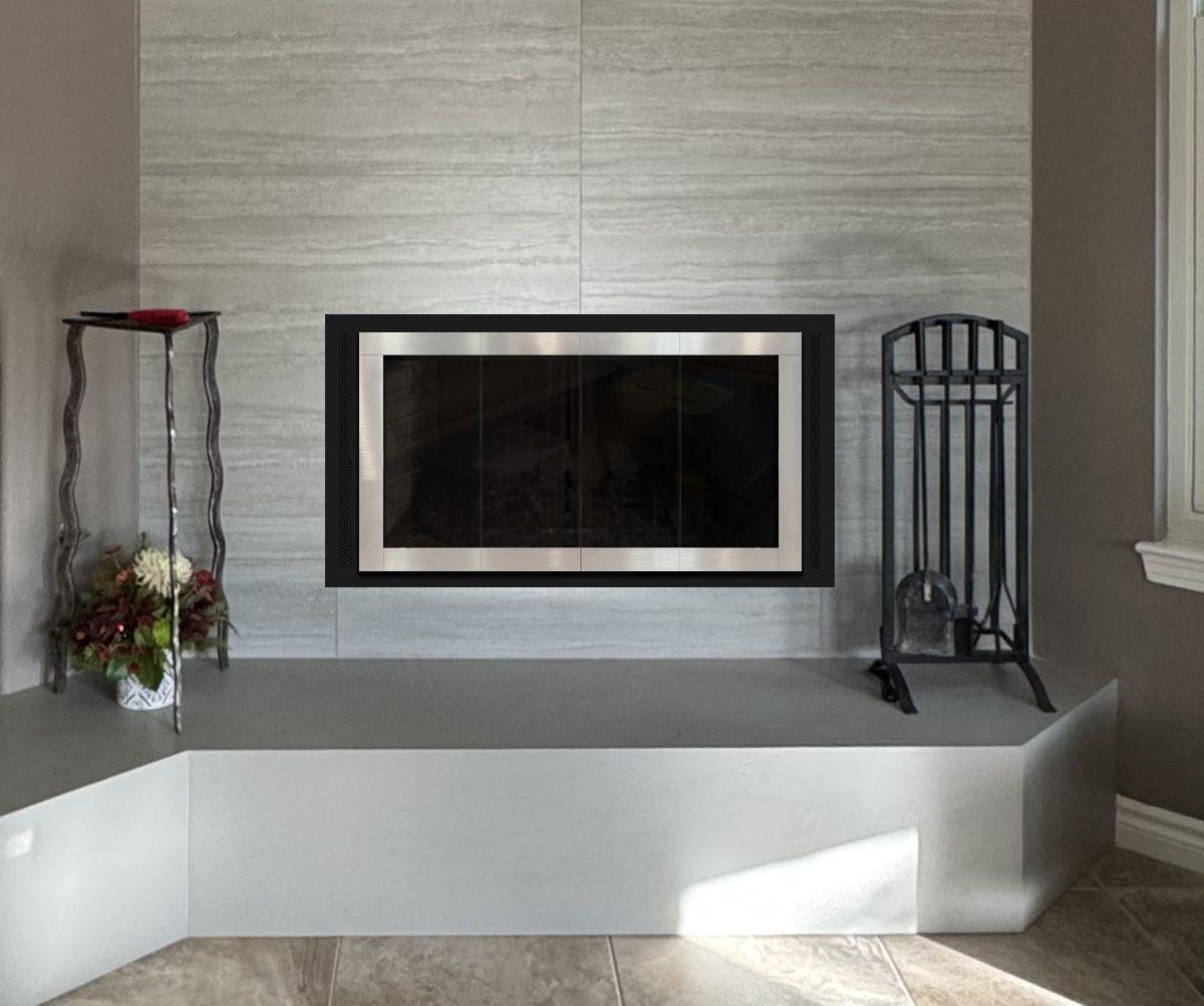Option #1: Design Specialties Stiletto Aluminum Bifold Fireplace Door in Black with Gray Glass. This door fits inside the black metal.
