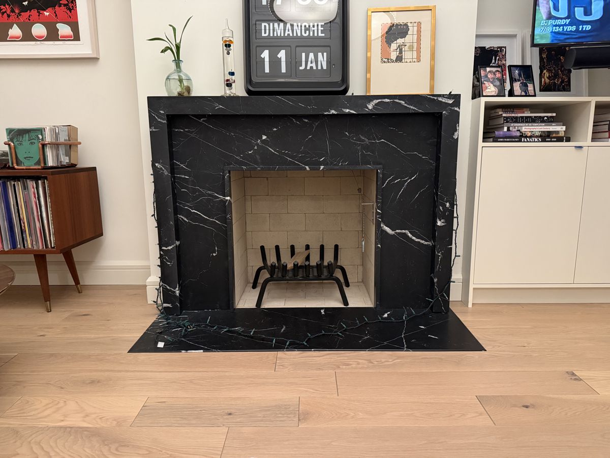 Our Comments: The marble trim around the opening poses a slight design challenge. Ideally, the screen would fit inside the opening to allow the lip to be seen as a design element. However, fitting the sreen inside means it must stand on its own, so it would need to stand out about 5" away from the opening, which does not provide good spark protection. If you use a free standing screen, I believe it needs to just overlap the marble. I have presented several other options of ways to fit attached screens and doors inside the opening.