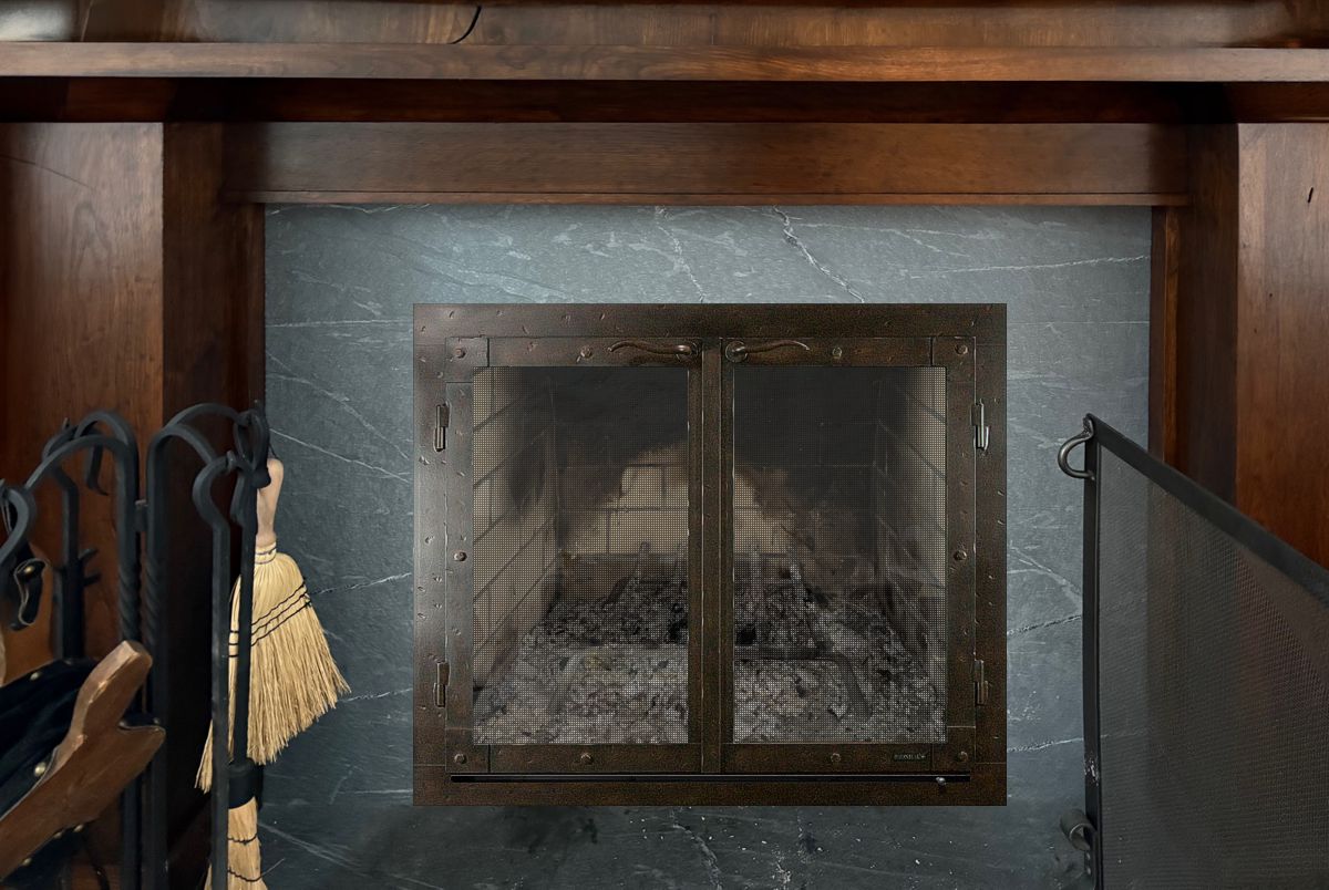 Option #4: Hand Crafted Olde World Wrought Iron Cabinet Fireplace Door in Hammered Medium Bronze with Tempered or Ceramic Glass and Heavy Duty Gate Mesh Backup Doors.