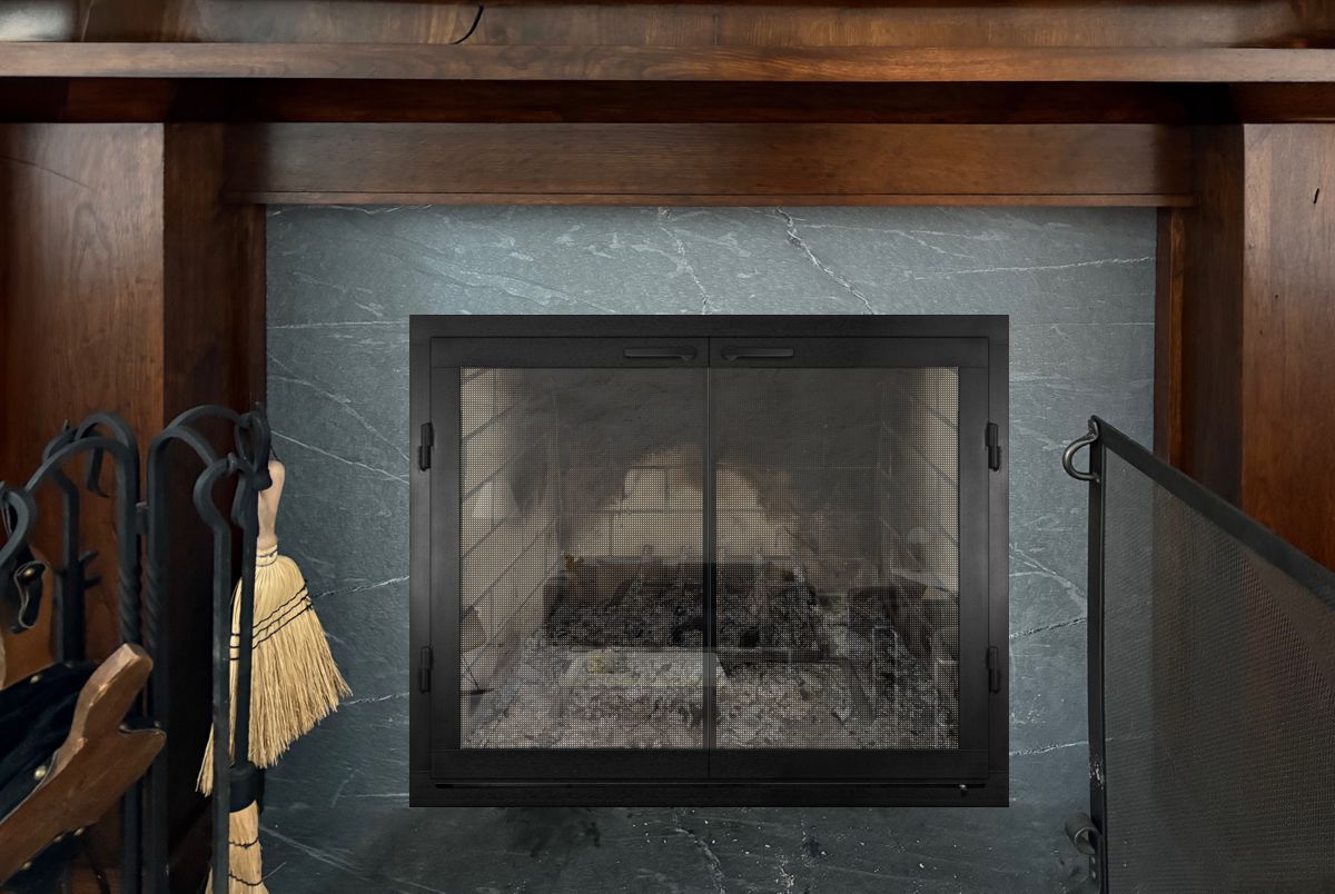 Option #1: PW Creekside Aluminum Cabinet Fireplace Door in Black with Tempered or Ceramic Glass and Mesh Curtains.