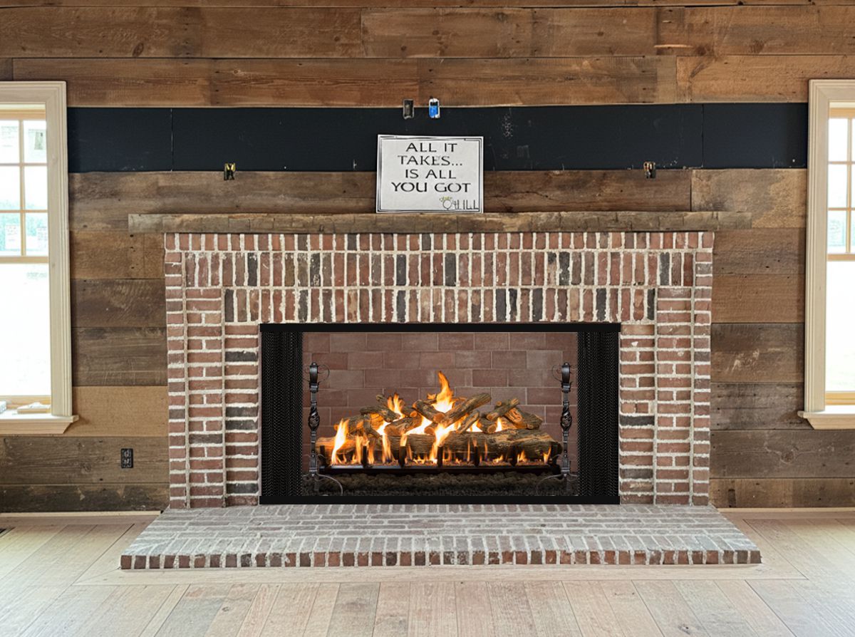 Option #3: Grand Canyon 60 Inch Jumbo Arizona Weathered Oak Gas Logs. Shown with Closout Special* WI-AN7 32" Tall Segovia Wrought Iron Andirons and Mesh Curtains.