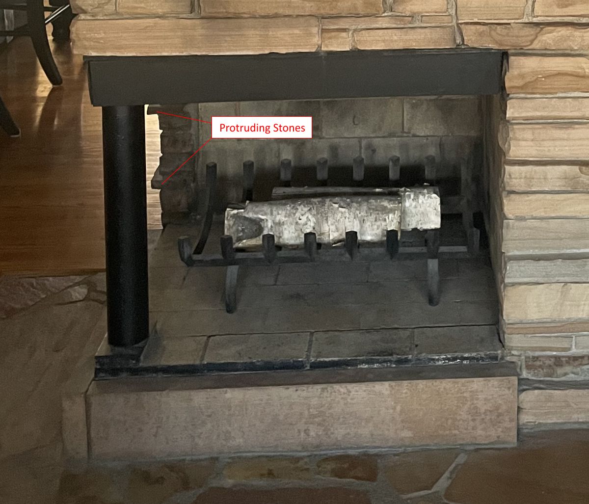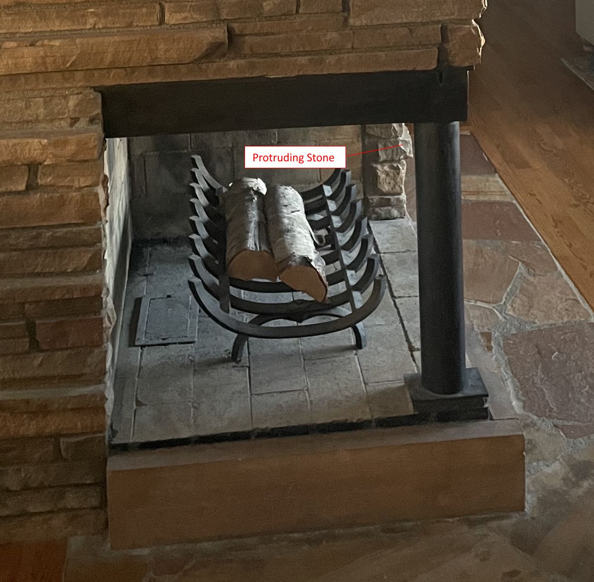 Our Comments: The position of the post and the raised bricks at the bottom of the opening, combined with the irregular stones, limit your choices. Sliding mesh curtains will not work, so glass doors are really the only option, although they can be made with mesh doors instead of glass. The less expensive doors must be made as an overlap fit to get around the post. The protruding stones on both sides that will need to be trimmed in order for the frame to lay reasonably fat to the opening. The high-end wrought iron doors can be made to overlap or fit inside, but have a subframe that must be knotched to fit the lip at the bottom where the fireplace floor is raised. You will need to fill the gaps around the opening with mortar for the inside fitting door. I am showing examples of two types.