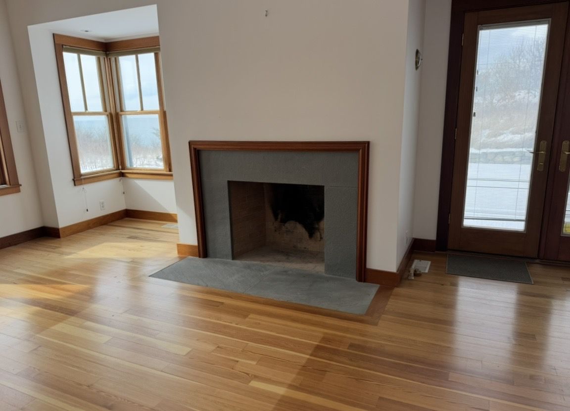 Customer Comments: Nice to speak with you. Photo of fireplace, although wood trim surrounding is now gone. Fireplace measures approx 35” left to right. About 18” from back to front before slate. Very windy house location, so want to be able to close off fire while burning. Discussed creekside model with you - looking for minimal frame, black, with venting. Thank you!