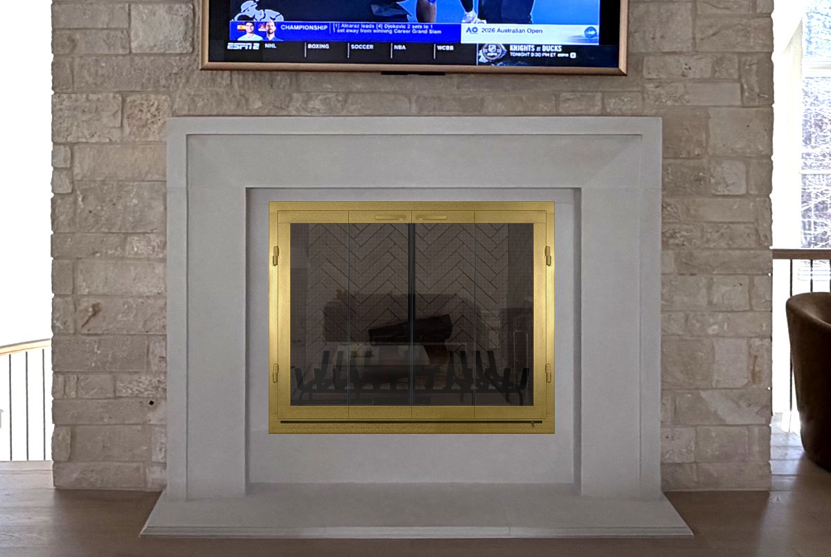 Option #6: Hand Crafted Heavy Duty Wrought Iron Cabinet or Bifold Fireplace Glass Door in Burnished Matte Plated Brass with Tempered or Ceramic Glass and Heavy Duty Gate Mesh Backup Doors.