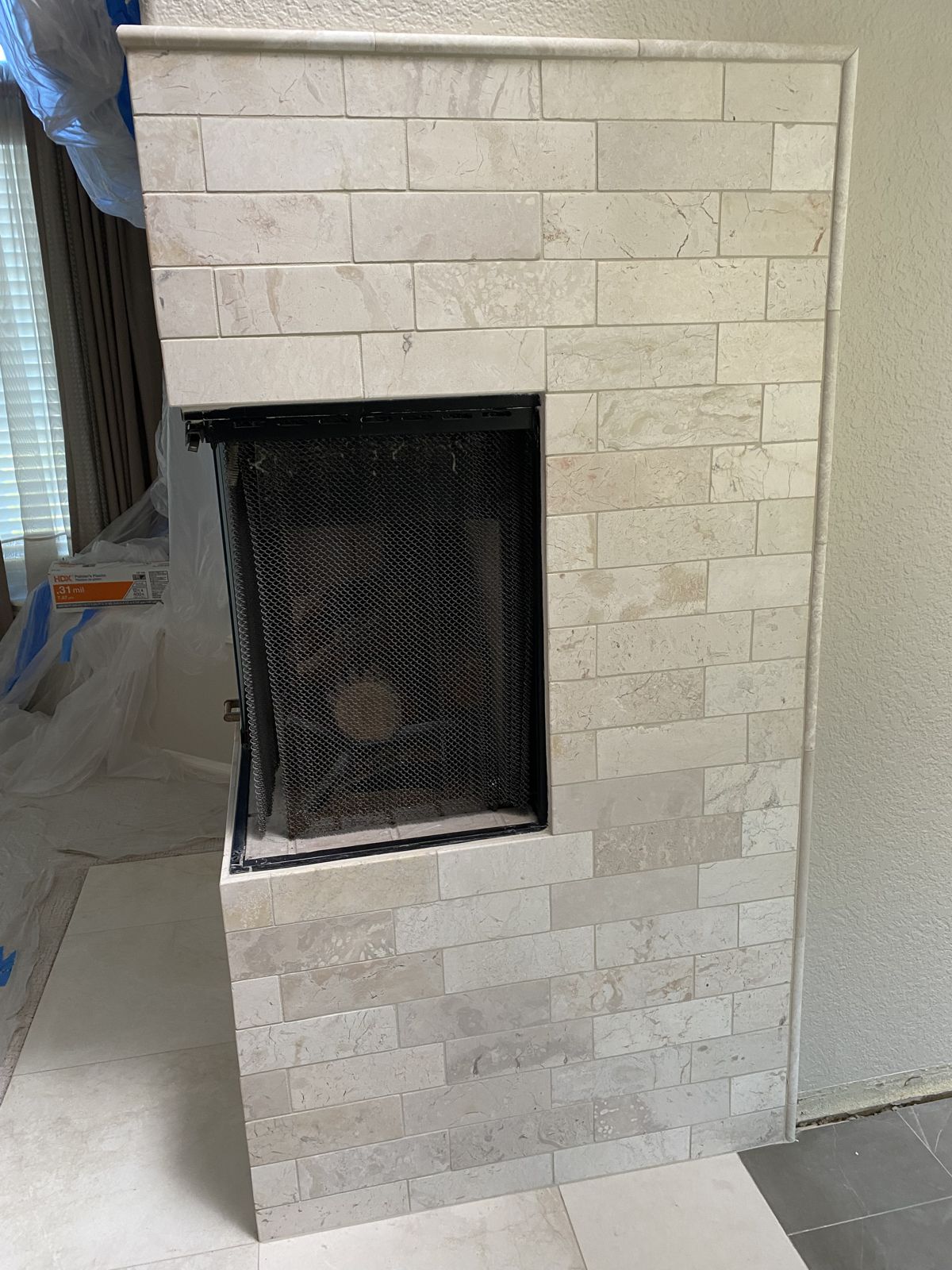 Our Comments: There are two choices for doors on this type of fireplace. Doors that fit inside the black metal opening and doors that overlap the tile. Overlap fitting doors must have a vent at the top to allow air to flow freely into the fireplace. The short side will have a fixed glass panel or single door. These can be made with just glass doors or with gate mesh backup doors behind the glass.