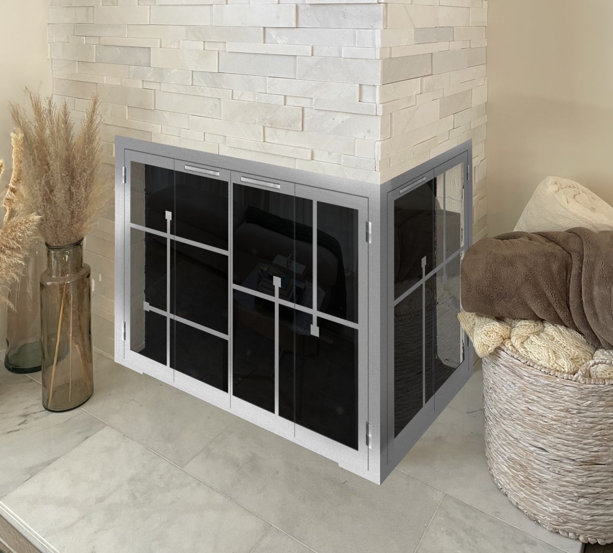 Option #3: Hearth Creations Corner Bifold Fireplace Glass Door in Solid Seamless Satin Stainless Steel or Brushed Chrome Sheet Metal Overlay with Seams with Gray Glass.